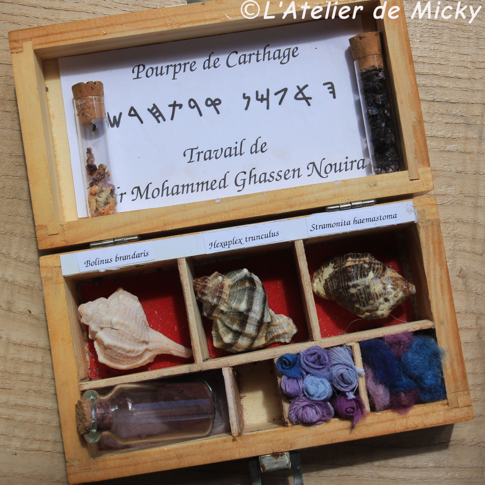 Voici un coffret réalisé par Mohammed Ghassen Nouira, de Cartage en Tunisie et qui travaille depuis des années sur la pourpre de coquillages. Le coffret n’a pas pu sortir en public en 2020… Je l’ai personnalisé à mon goût avec les noms latins des coquillages (mon côté naturaliste, je ne peux pas le renier…) et deux petites fioles supplémentaires pour les glandes séchées. J’adorerais voir la teinture en pourpre de coquillages en vrai, qui a des similitudes avec la teinture à l’indigo, utilisant une cuve réduite, mais pour le moment, je suis contente de pouvoir montrer les bestioles et les résultats obtenus quand j’interviens au sujet des teintures historiques!