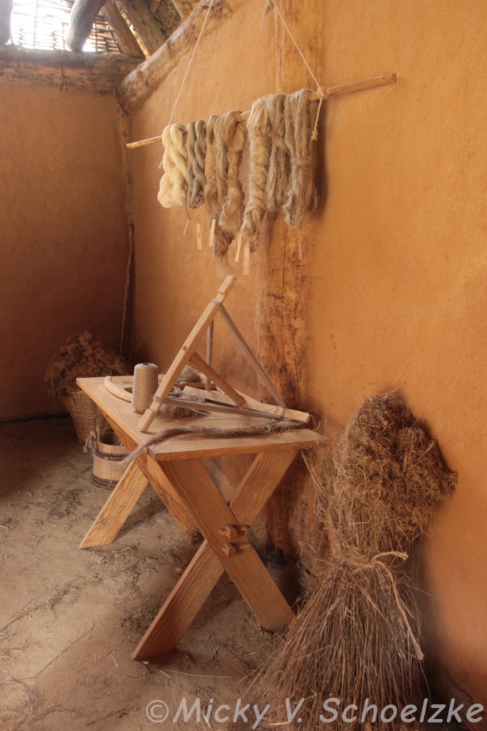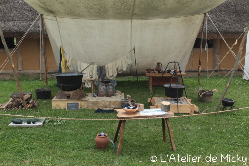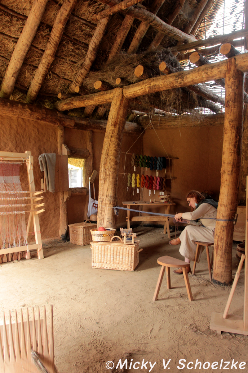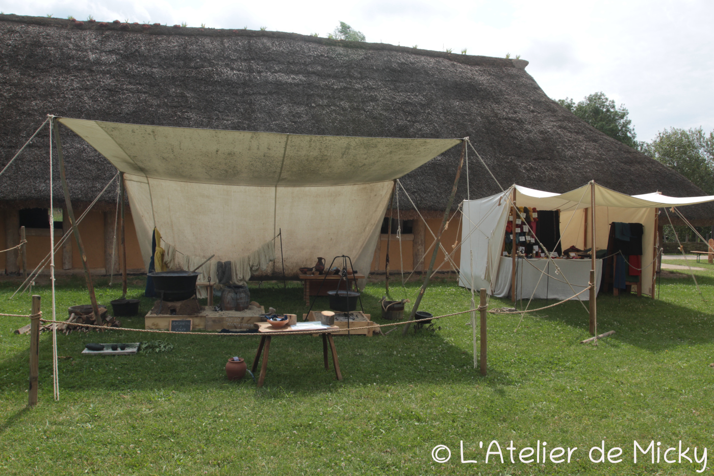 La maison à droite de mon campement est la nouvelle maison dédiée au textile du parc archéologique. J’ai modestement contribué à son contenu avec notamment des laines teintés. On y présente et explique la teinture, le tissage aux tablettes, au peigne et sur métier vertical à pesons, ainsi que les étapes de la préparation du lin.