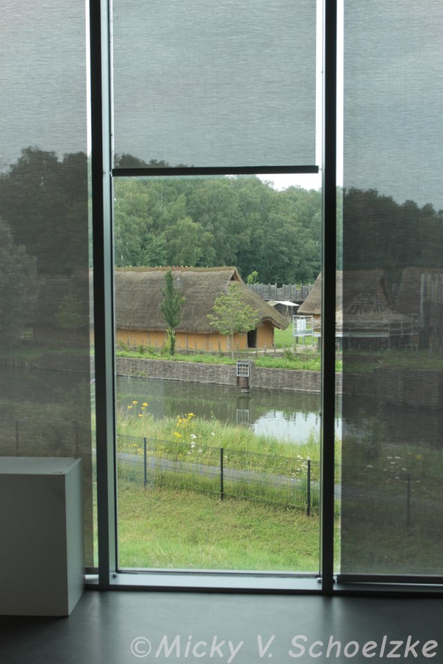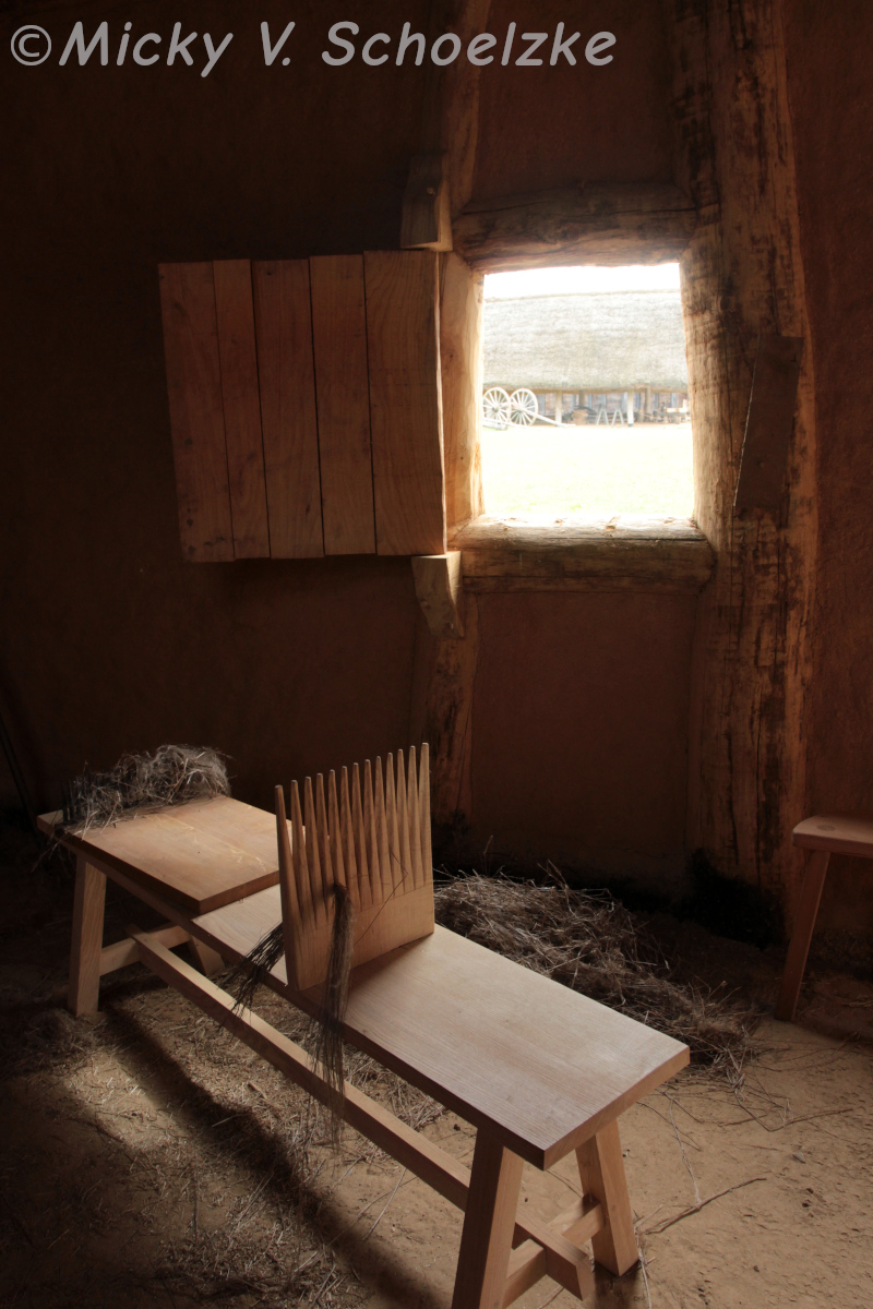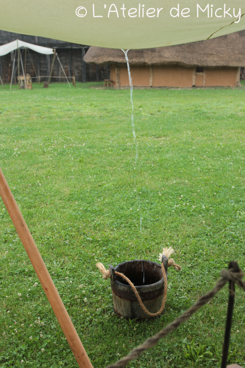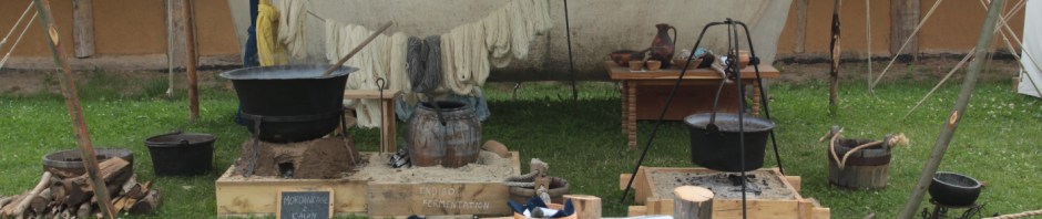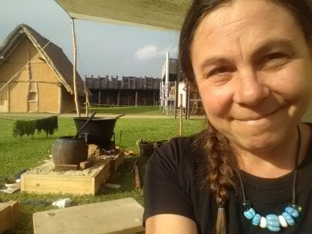La maison à droite de mon campement est la nouvelle maison dédiée au textile du parc archéologique. J’ai modestement contribué à son contenu avec notamment des laines teintés. On y présente et explique la teinture, le tissage aux tablettes, au peigne et sur métier vertical à pesons, ainsi que les étapes de la préparation du lin.