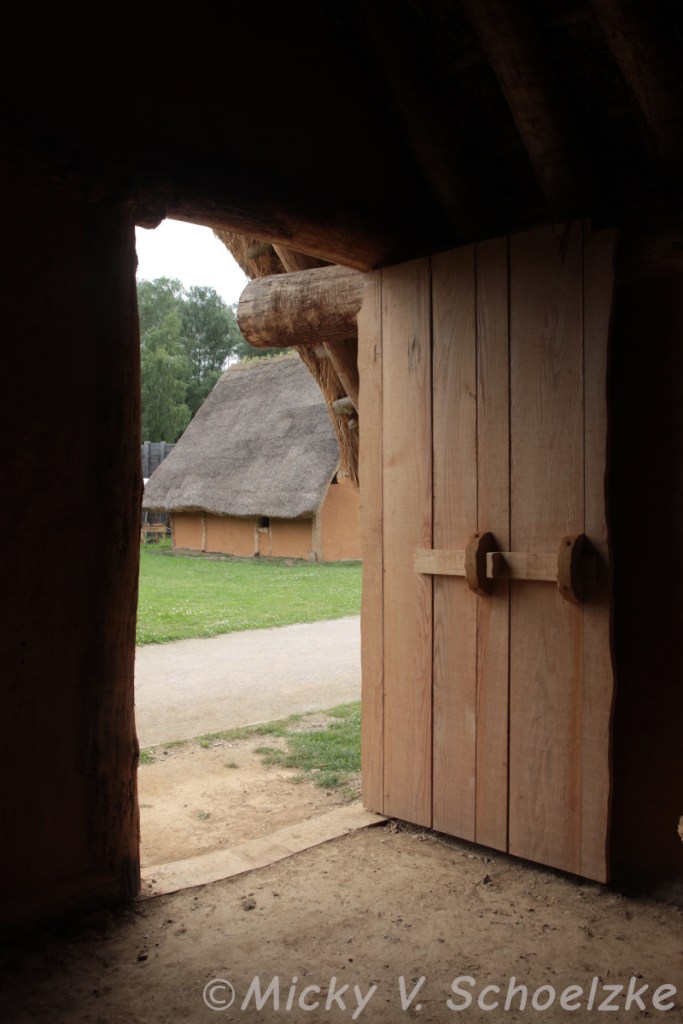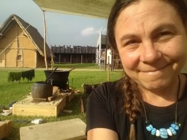 The house on the right of my encampment is the new textile house of the archaelogical park. I contributed a little bit to its contents, with some dyed wool skeins. Dyeing, tablet weaving, rigid heddle weaving and vertical weight loom weaving, as well as linen processing are displayed and explained in the house.
