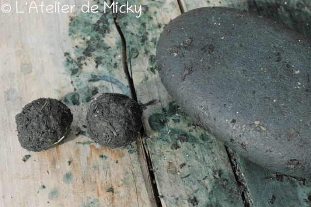 Saturday morning, I made a few balls from leaves I had harvested the day before at home. I use them afterwards to explain how you go from plant to dye in the Middle-Ages.