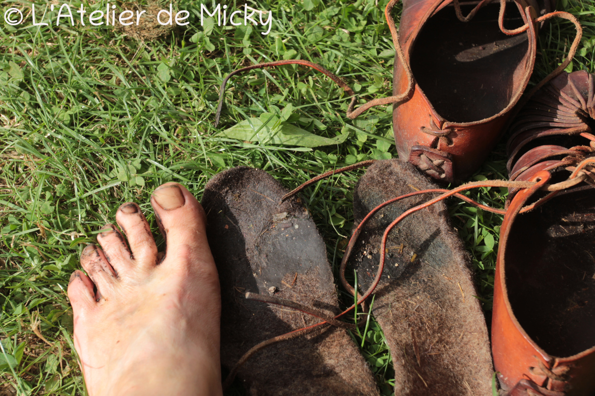 J’avais oublié ma deuxième paire de chaussures historiques… Entre le sol détrempé et les éclaboussures de teintures et de rinçages, mes pieds ont connu une bonne macération dans des chaussures trempées qui ne séchaient jamais. On y ajoute l’odeur des plantes, de la cuve de fermentation et de la fumée… Mon métier est très loin d’être glamour!