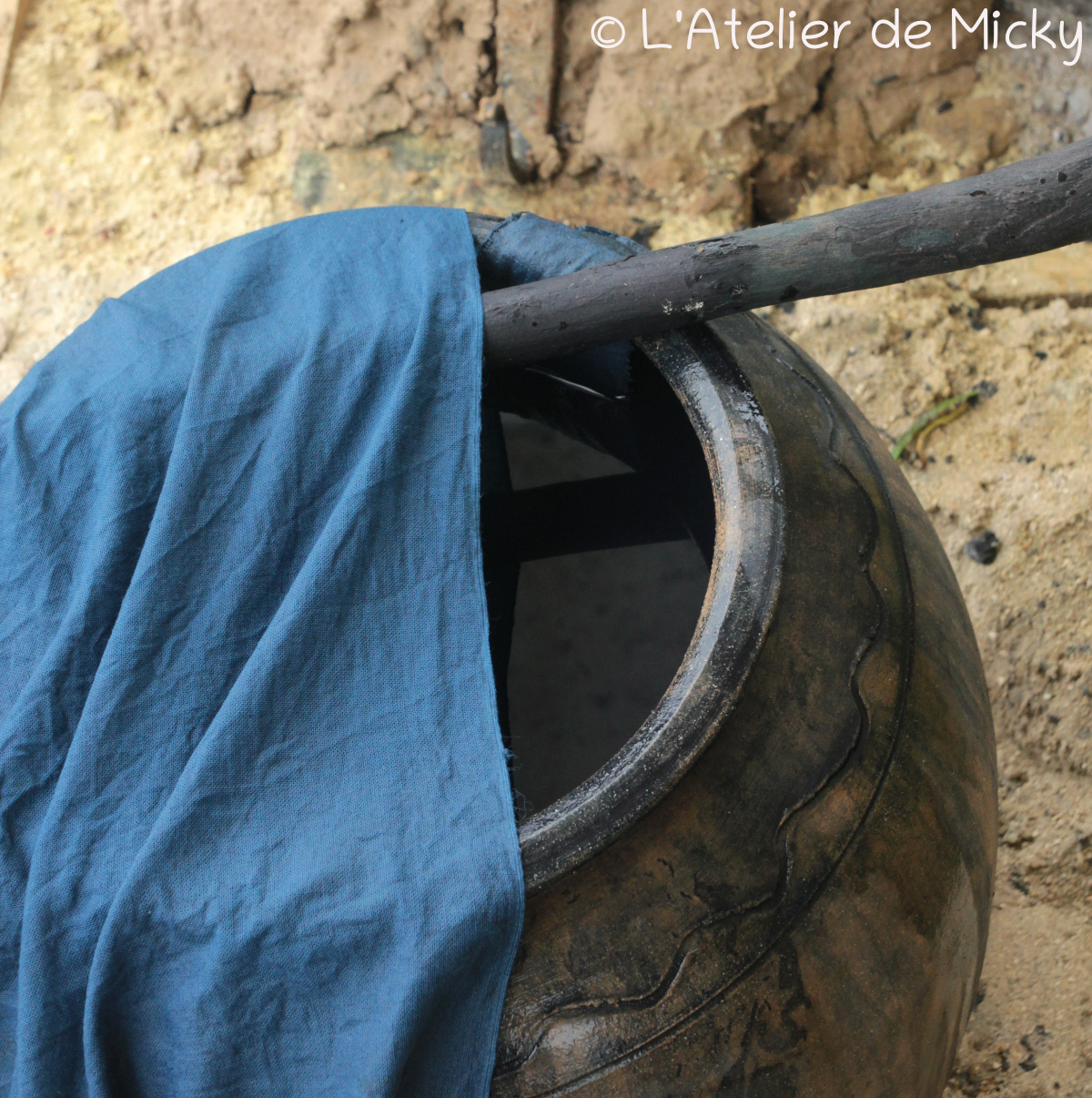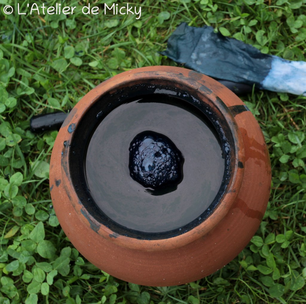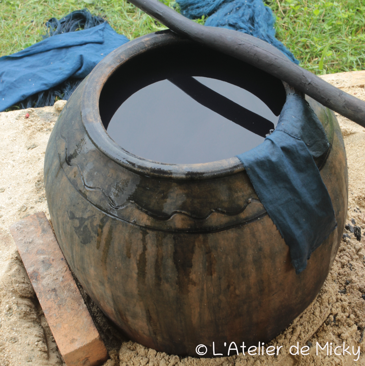 Along with « Lucius », I also took « mini-Lu », another much smaller pot containing a lime/iron vat. I use it closer to people to show my « magic trick », the oxidation in the blue-green into indigo on small cotton stripes, which is quite spectacular with this type of vat and always impresses the public.