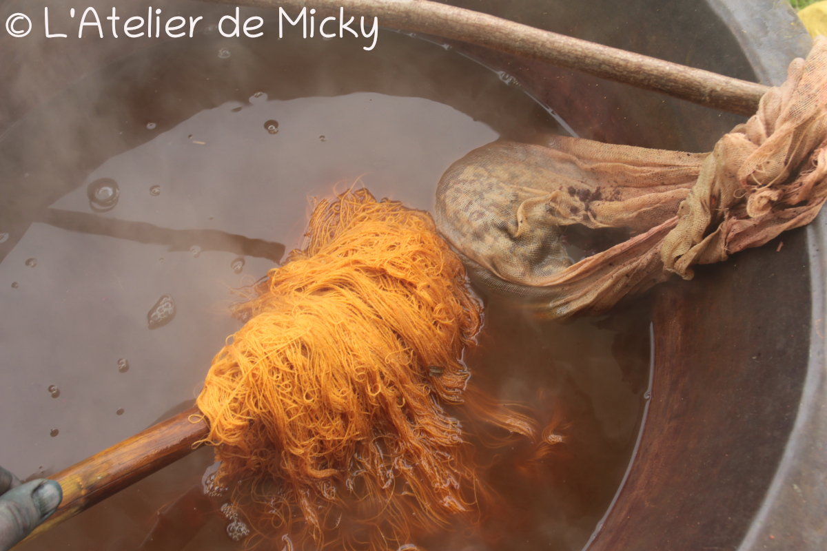 Orange clair le dernier jour avec ajout d’un reste de garance au bain d’épuisement de gaude. le dernier jour, je dois arrêtr la chauffe de ma grosse cuve assez tôt, pour que le foyer ai le temps de refroidir avant que je démonte mon argile pour le transport.