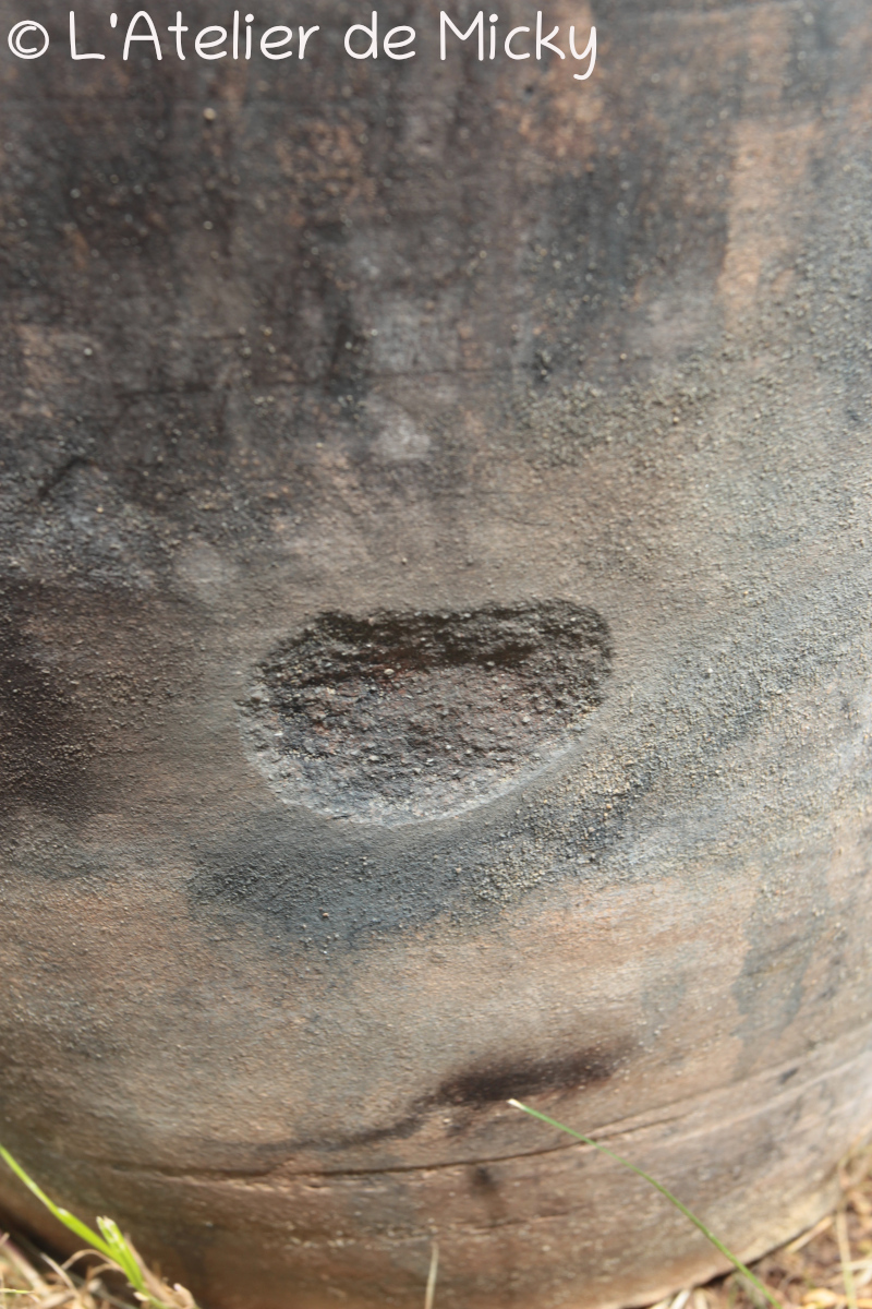 Poor Lucius suffered its first occupational accident! The wood I was using didn’t produce much nice embers and I put some charred pieces near the pottery. One of them caught fore again and exploded, causing a chip on my precious demo companion… Luckily more shaken than hurt!