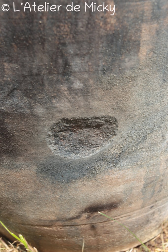 Mon pauvre Lucius a subi son premier accident du travail! Le bois que j’utilisais ayant du mal à donner de vraies belles braises, je mettais des morceaux carbonisés encore chaud près de la poterie à la place, mais l’un d’eux a repris de la flamme et a explosé, cela a causé un éclat sur mon précieux compagnon d’animation… Plus de peur que de mal heureusement!