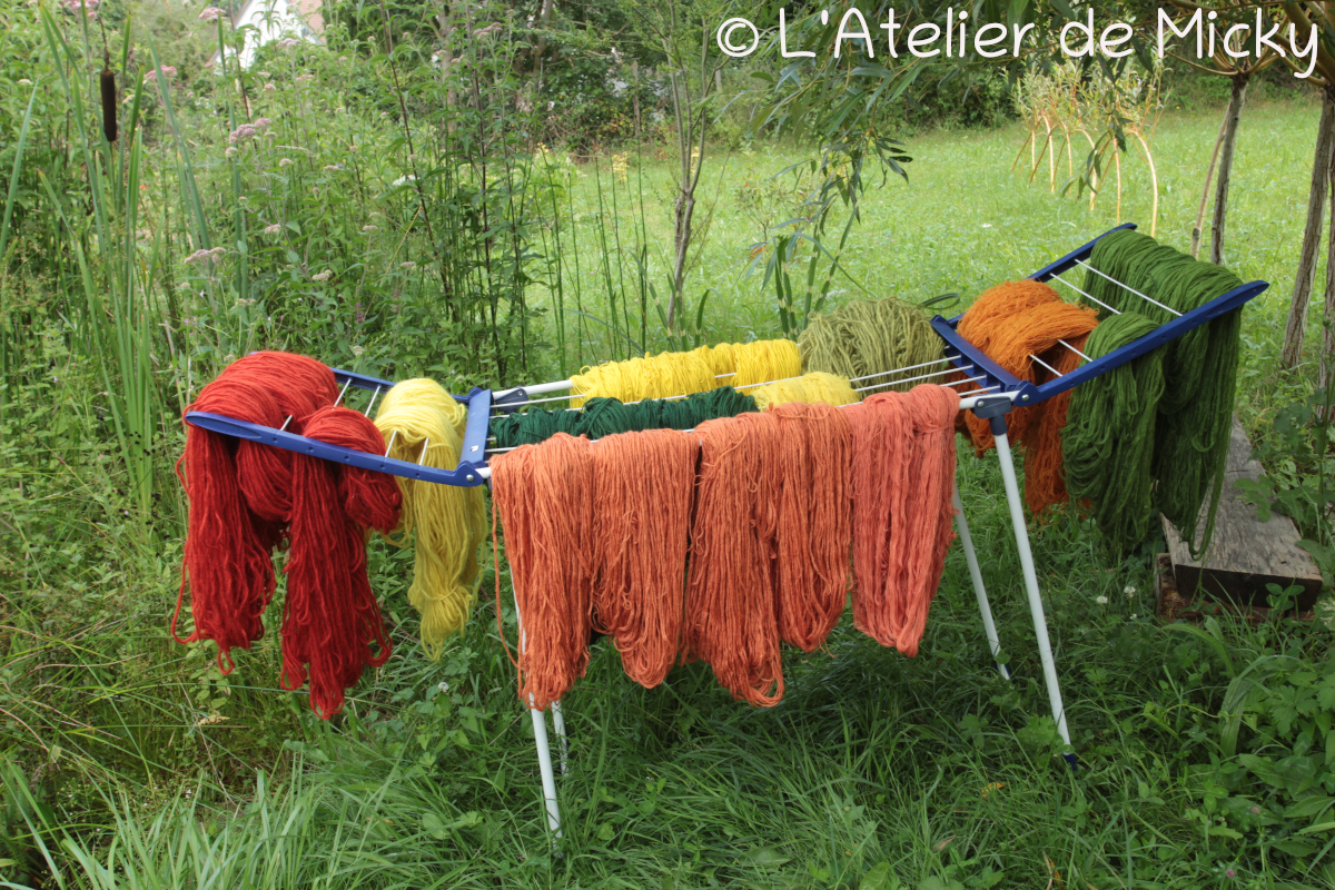De retour à la maison, les laines teintées et moi avons retrouvé notre habitat naturel dans la verdure près de la forêt! Les laines teintées samedi matin n’étaient toujours pas sèches le mardi soir quand j’ai remballé mon matériel…