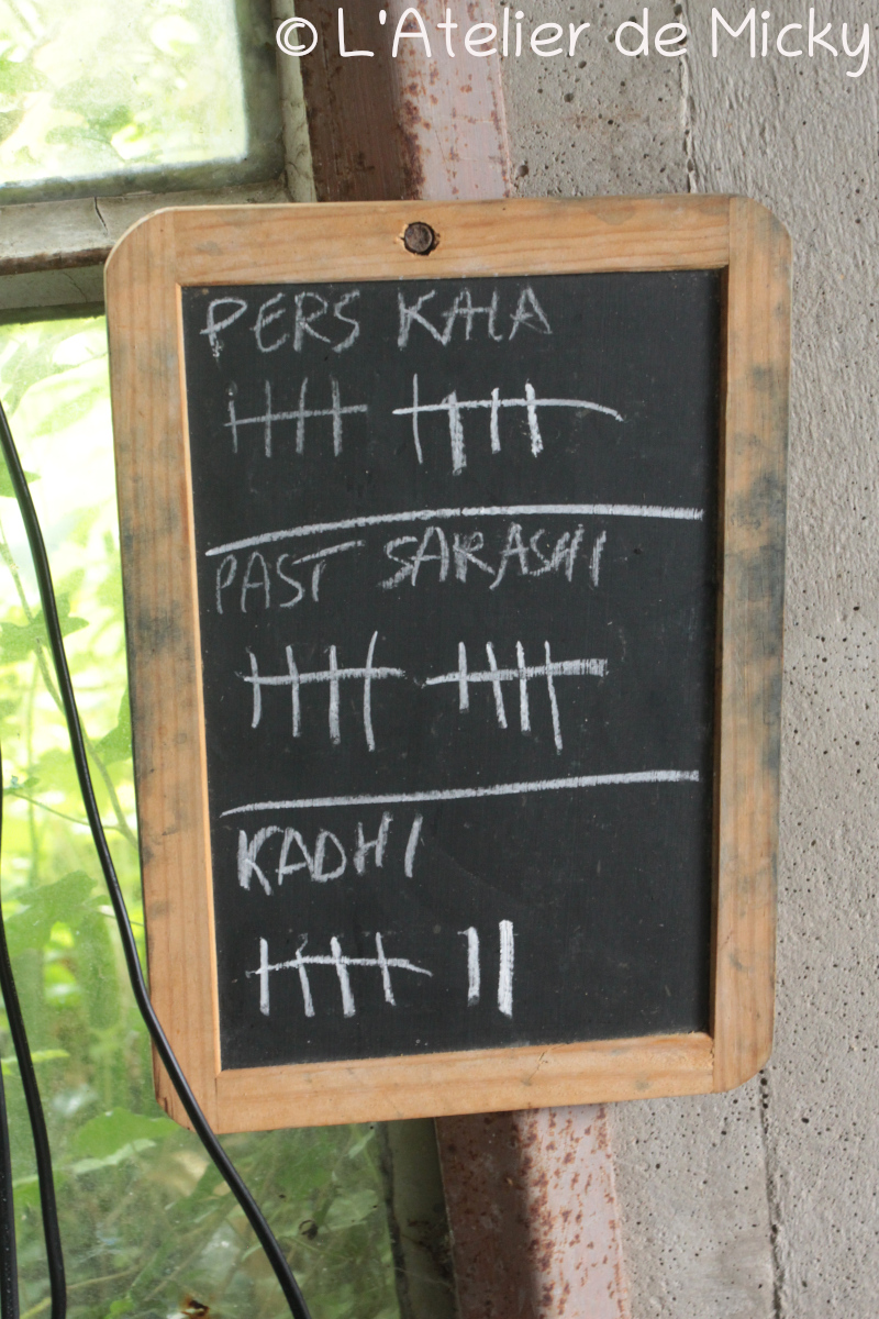 Faire les petites échevettes de laine à broder est aussi une partie longue et ennuyeuse du travail, mais quand il y a du soleil, et bien on trouve toujours un coin agréable pour faire ça!