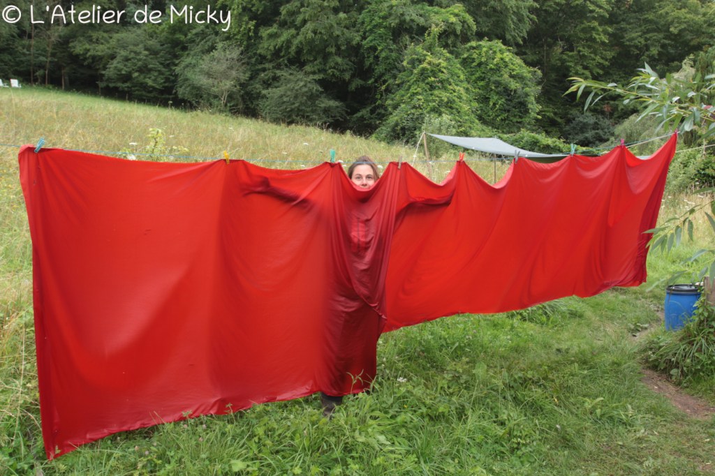 Avant de partir deux semaines en août, pour mon traditionnel forum textile et quelques jours en Allemagne, j’ai du terminer pas mal de teintures, dont une assez spectaculaire: 6m de sergé de soie à la garance. Le genre de pièce que je ne fais pas tous les jours et qui demande beaucoup d’efforts et d’attention pour ne pas avoir de taches!