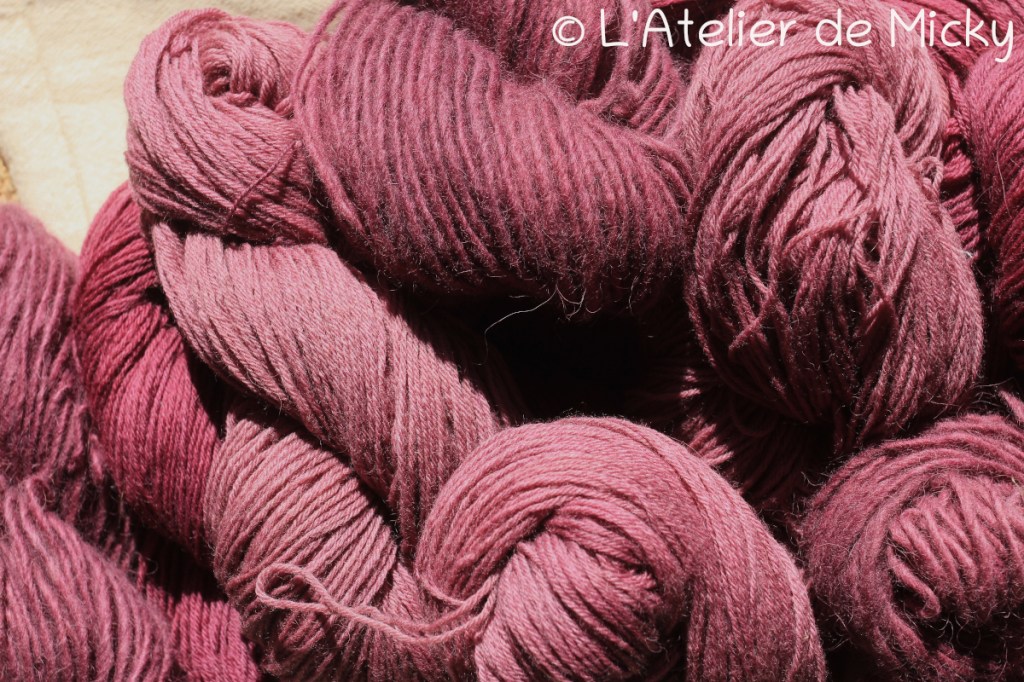 Voici une image d’une jolie session de teintures à la cochenille, pour des roses et des violets…