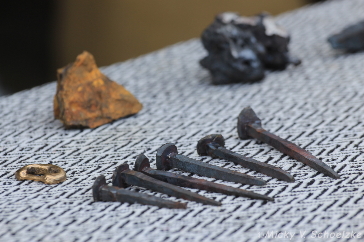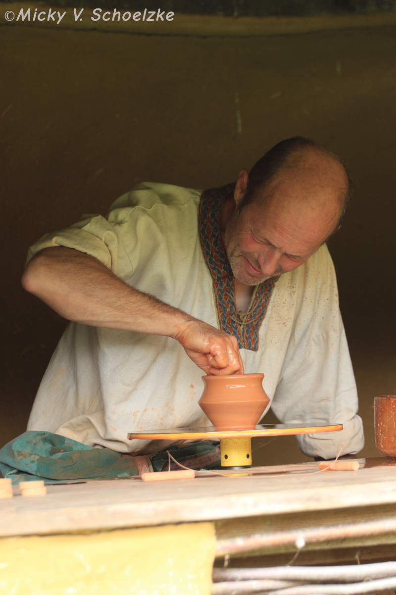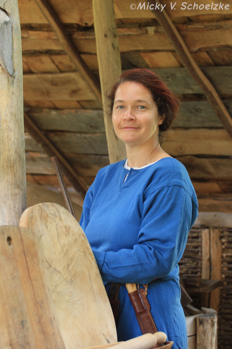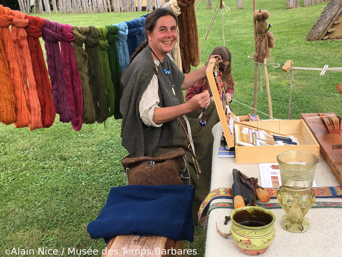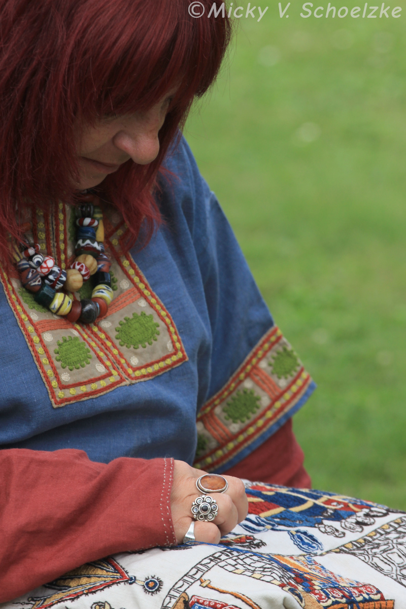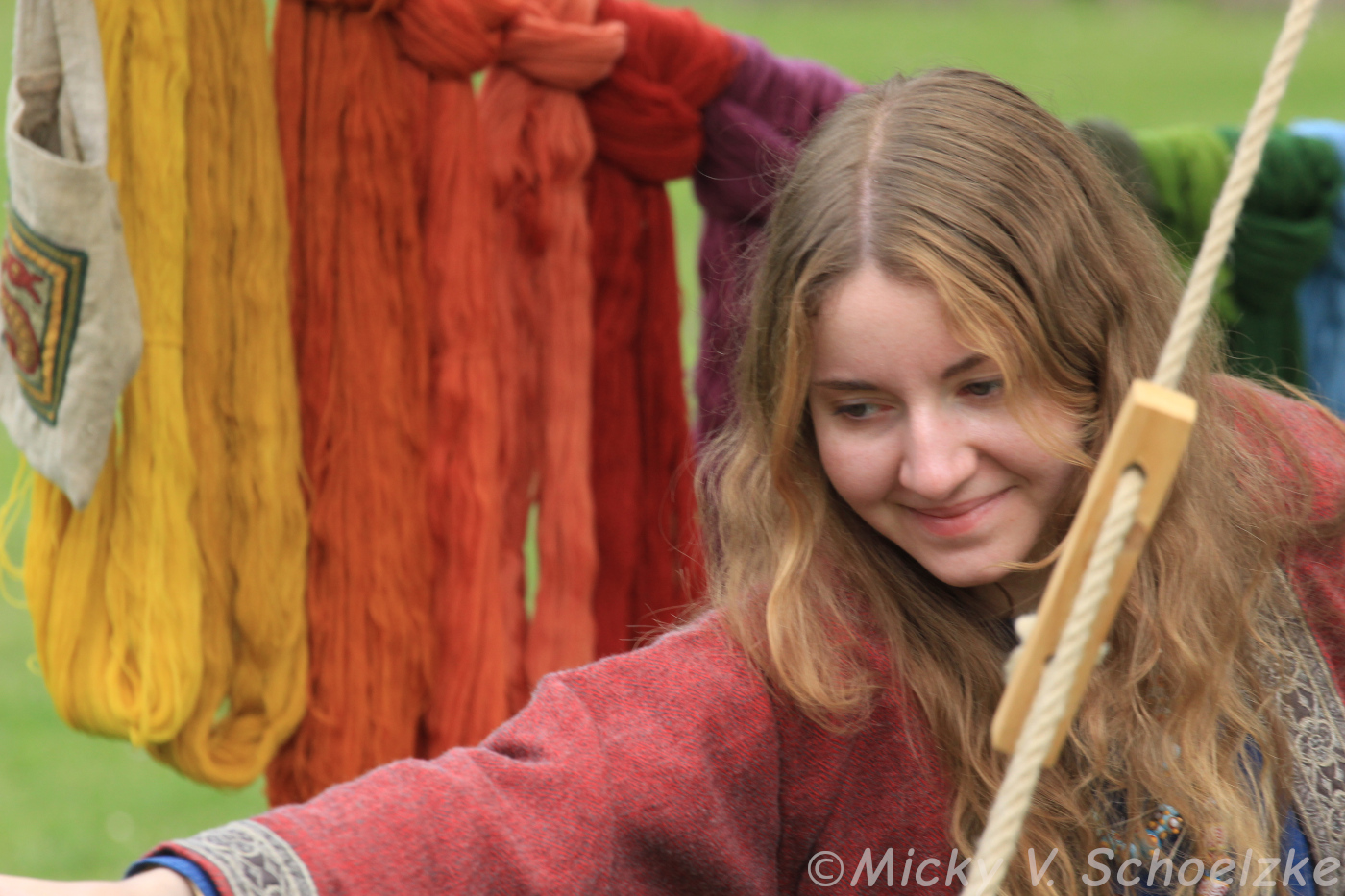 Quand je ne fais pas de démonstrations de teintures, je peux, pour une fois, mettre un costume « chic ». D’habitude je ne peux faire ça que le soir! Ce n’est que le début d’un costume sur lequel je travaille depuis pas mal de temps, d’après des pièces d’une tombe du Vème siècle. J’ai encore beaucoup de travail pour terminer, mais c’était chouette de porter certaines des pièces pour la première fois!