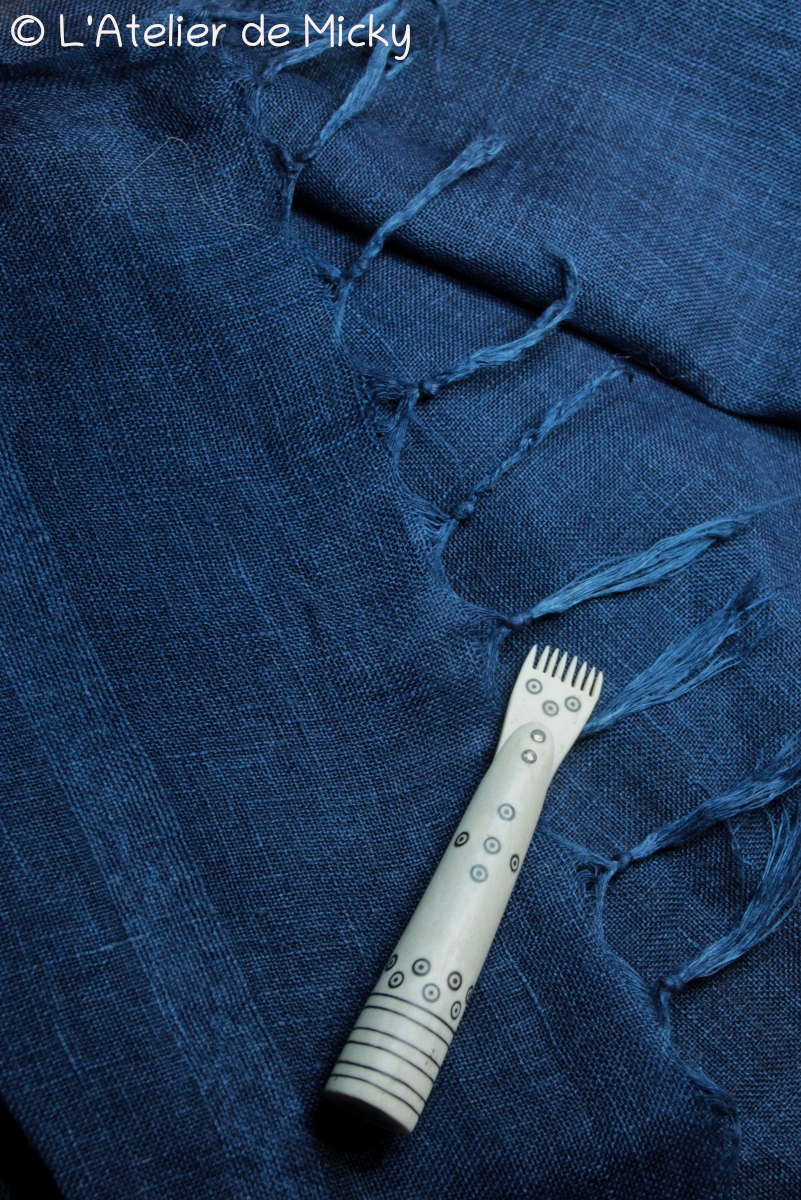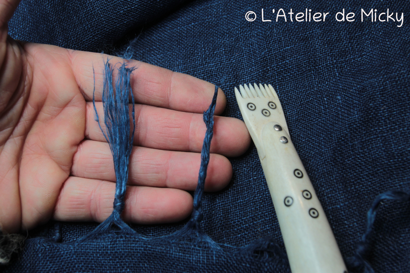 Une belle étole en lin tissée main (Inde): les franges d’une pièce finie souffrent toujours un peu à la teinture, il leur faut un petit coup de peigne! Le peigne est une reproduction d’une pièce archéologique de l’ère viking (Birka, Suède). j’ai déjà dit que j’aimais les beaux outils de travail?