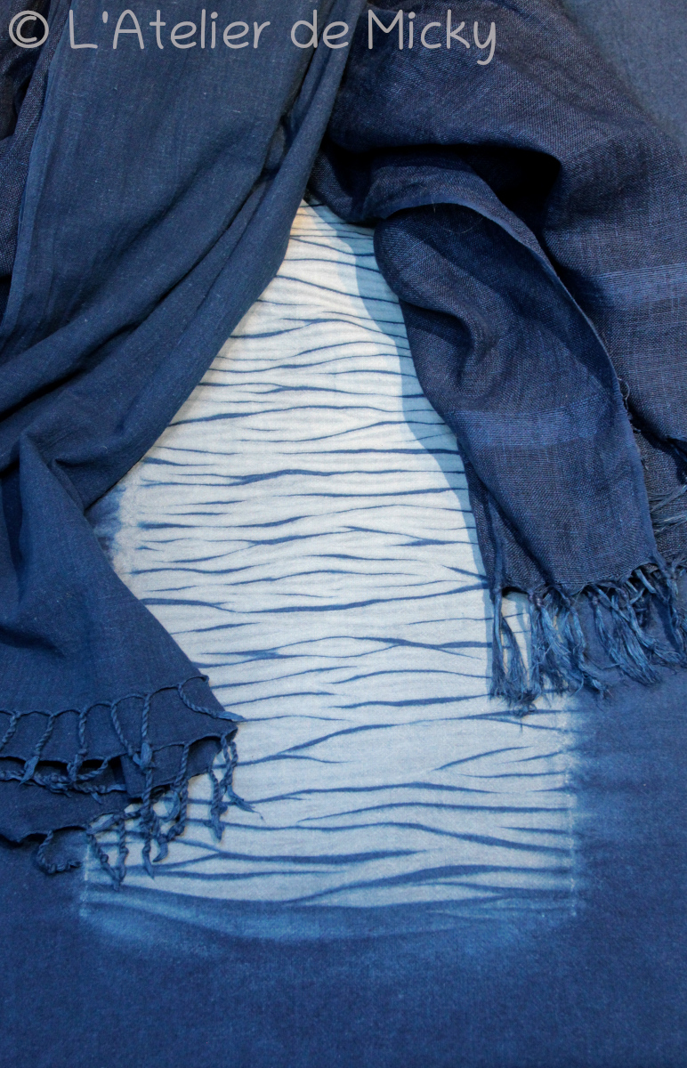 J’ai également refait une étole en coton recyclé façon arashi shibori.