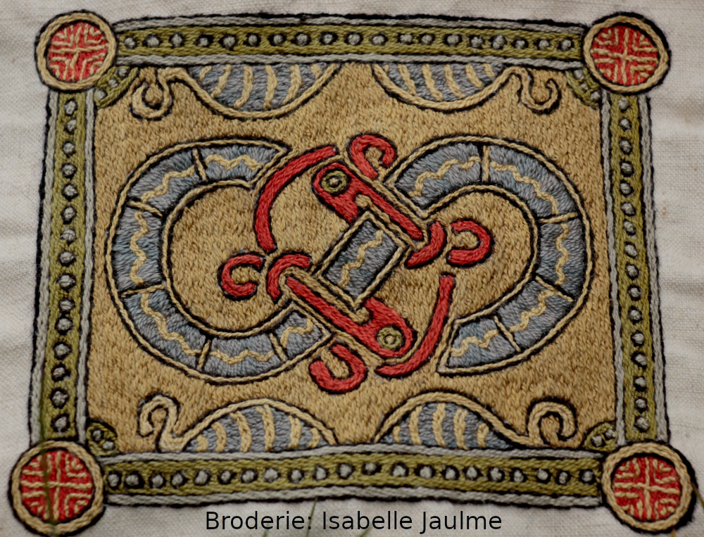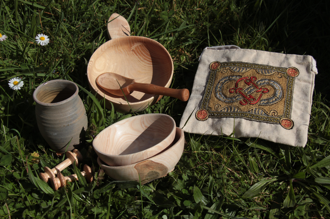 As this market was rather quiet, I was able to do some shopping, mainly things for my demonstration events. I was missing some wooden objects that I bought at some friend’s stall. Also a 13th century goblet (because I sometimes do some Middle-Age themed demonstrations wearing a 13th century outfit). And I fell in love with an embroidered pouch made by my friend Isabelle Jaulme, embroidered with my dyed silk threads.