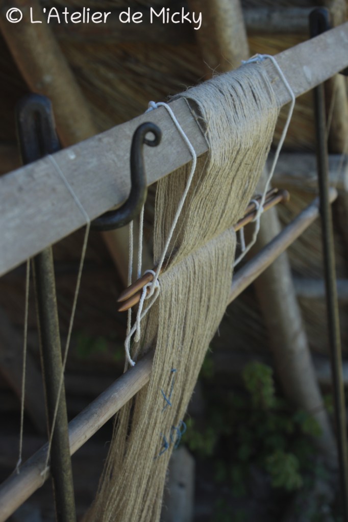 Le métier de Marle est à l’extérieur dans une cabane, un peu exposé aux éléments pendant la saison, j’ai donc choisi du lin assez gros, c’est vraiment pour avoir une chaîne dessus comme illustration pédagogique!