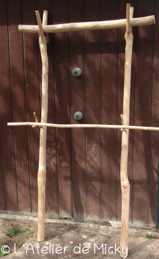 Comme je suis du genre têtue à ne pas m’arrêter en si bon chemin, je suis allée en forêt pour trouver de quoi construire un autre métier à pesons… J’en possède un en fait qu’on m’a donné il y a des années mais qui est un gros monstre massif que je n’ai pas la place de monter chez moi… Celui en cours de construction est moins encombrant. C’est du bois de merisier et de frêne, il est d’ailleurs compliqué de trouver les bons morceaux, avec les fourches de la bonne taille et les plus droits possibles. Ensuite c’est juste de l’huile de coude et un bon couteau à écorcer!
