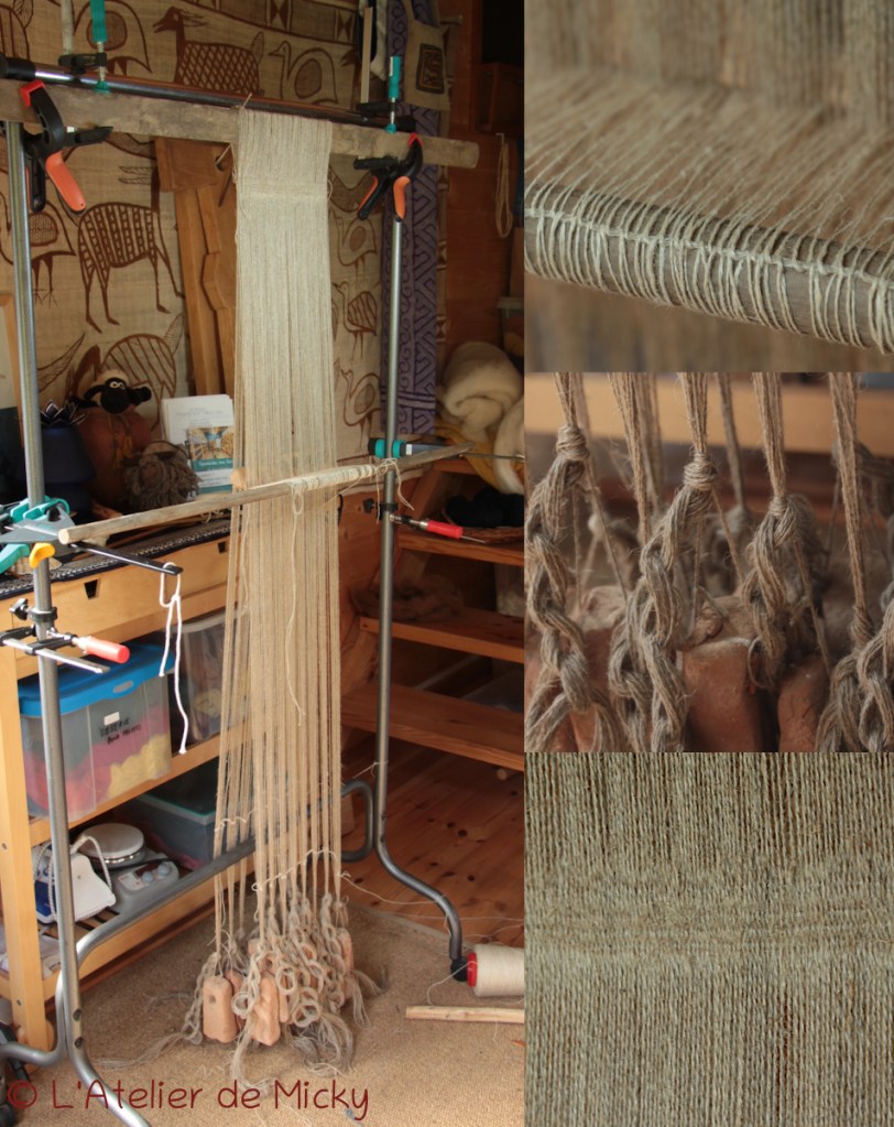 Le métier extérieur de Marle n’est pas vraiment prévu pour un tissage aux pesons, car il est droit et pas incliné, mais ça marche tout de même avec quelques ajustements.