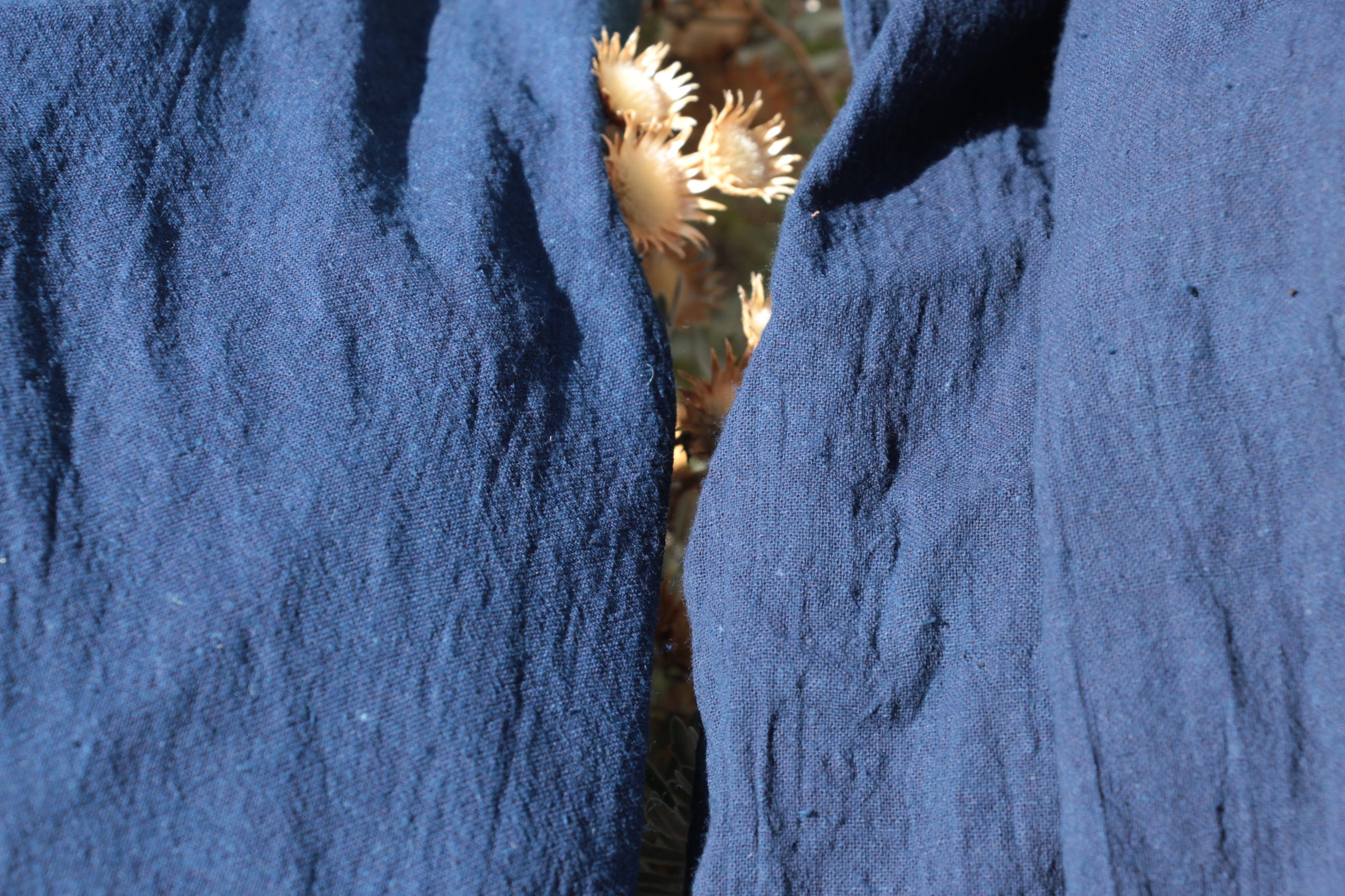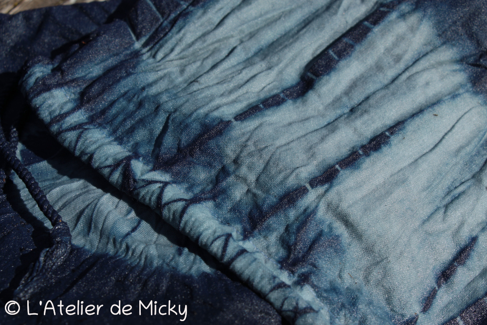 J’ai commencé par teindre deux écharpes en coton indien identiques, l’une dans ma cuve de la cave (qui est âgée d’environ 20 mois maintenant) et l’autre dans ma vieille cuve réveillée. Voici les deux écharpes sèches après une douzaine de bains chacune, la vivacité du bleu est la même (l’une est un poil plus foncée car les concentrations en indigo sont différentes d’une cuve à l’autre). Ça veut dire que ma vielle mémère est encore capable de faire d’excellents bleus indigo! Et ça me rend très heureuse.