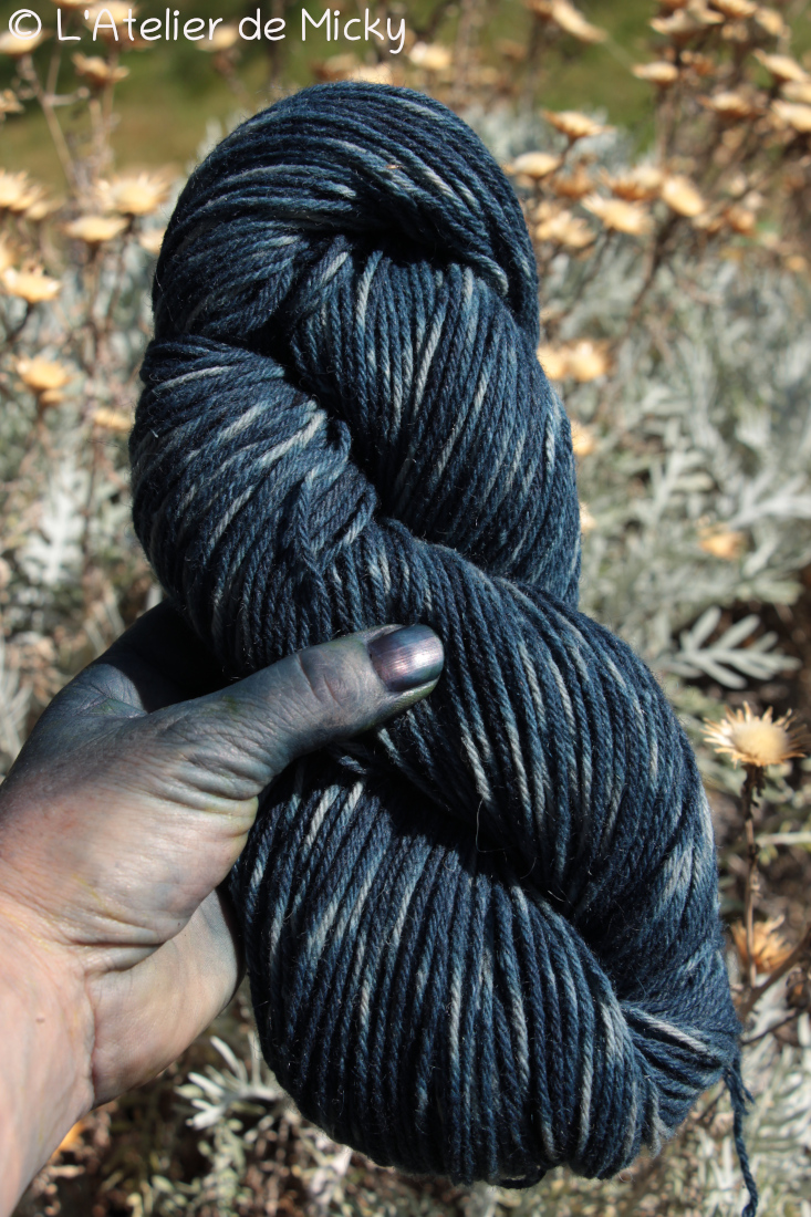 I also continued dyeing the « Reborn » recycled wool that I mentioned here some time ago. After some solid blue skeins, I switched to tie-dye on skeins. The Reborn wool is now in the shop as well.