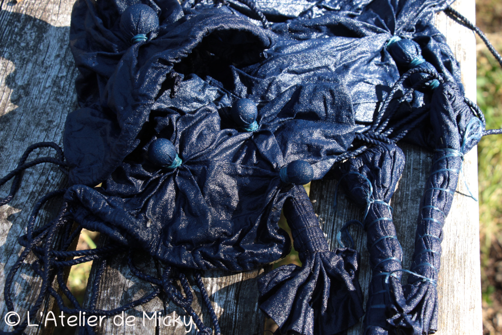 I started with dyeing two identical Indian cotton scarves, one in my basement vat (who is about 20 months old) and the other in my old outside vat. Here are the two scarves, showing an equal vivid blue (one is slightly darker because the two vats don’t have the same concentration). It means that my old lady is still capable of producing good indigo blues! And that makes me really happy.