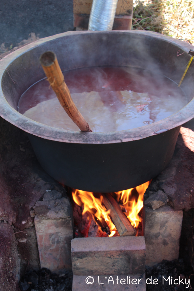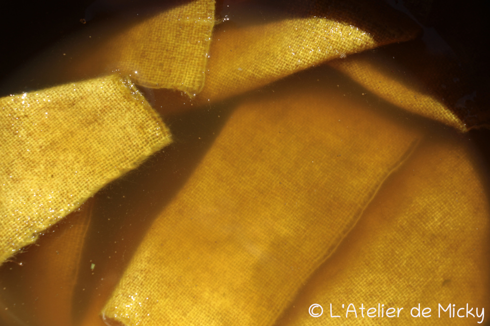 C’est en commençant cette teinture que je me suis aperçue que mon plus grand chaudron était fêlé et va devoir être réparé par une personne compétente… m’en passer est difficile, mais on va s’adapter! Utiliser un chaudron plus petit demande davantage de manipulations…