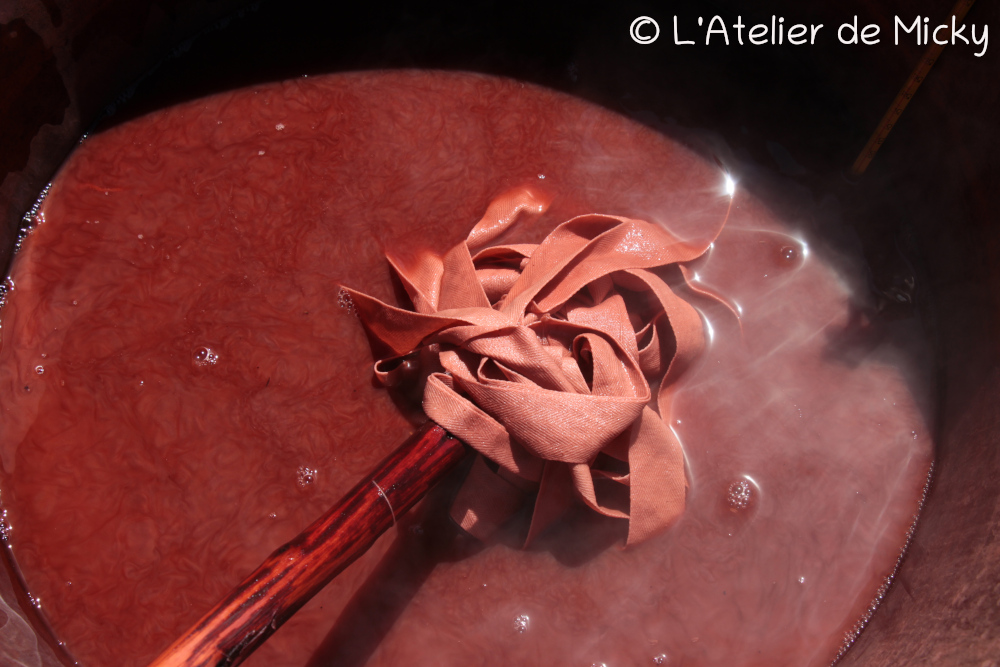 It’s harder to evaluate the final shade when dyeing linen or cotton than wool, but I had discussed it with my client beforehand and used a proportion of 13% Cutch (some recipes give 8%, others up to 30% but we had to make a choice here!). the result is a light pinkish brown, good enough for my client who was satisfied with the outcome and that is what counts!