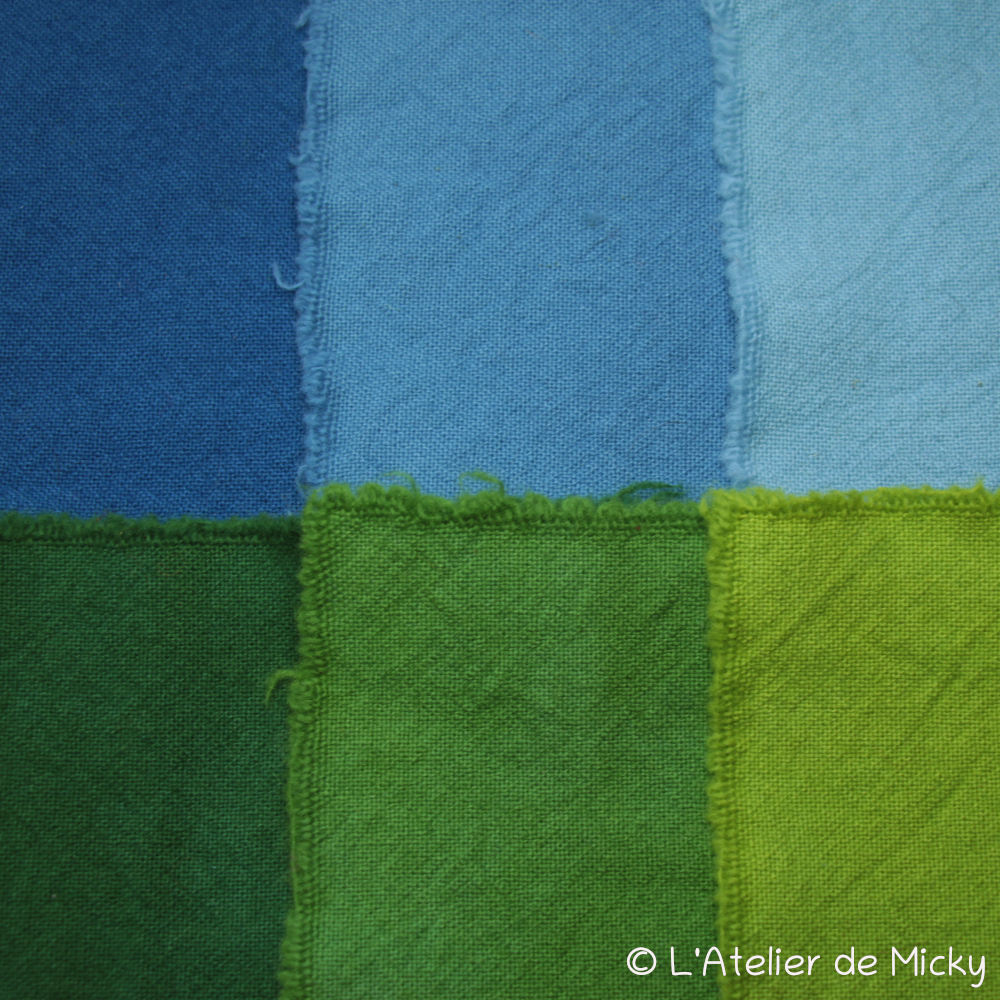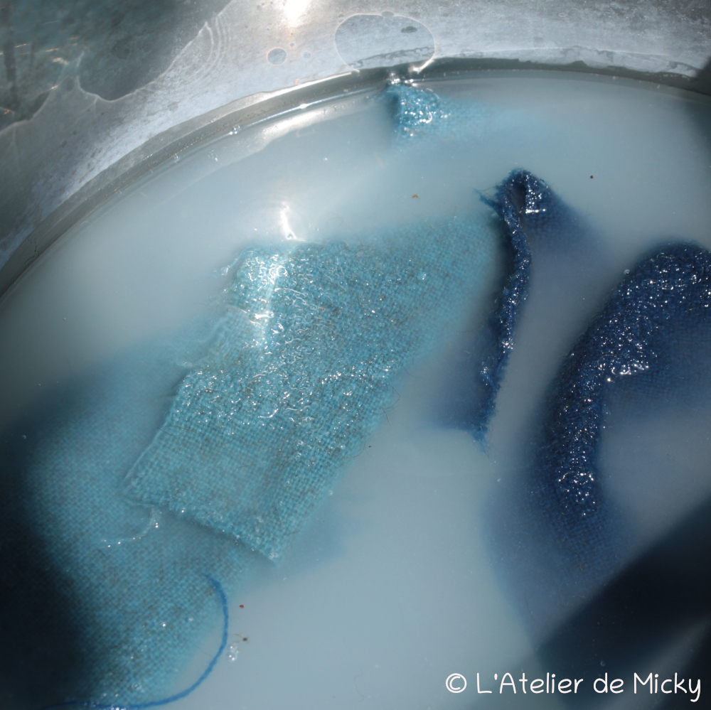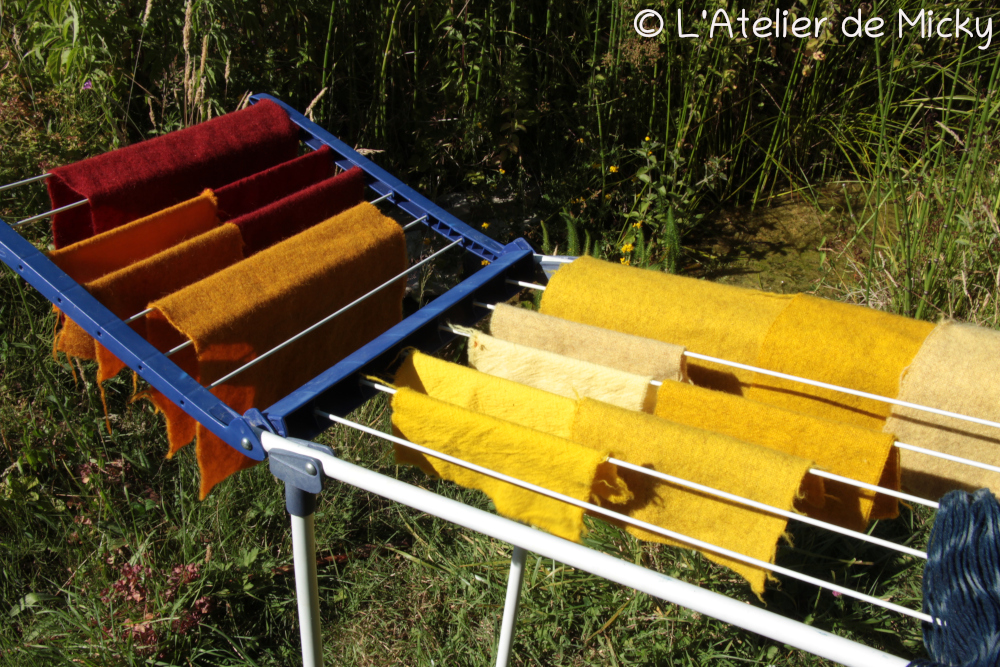 J’ai profité de cette commande pour teinter des petits échantillons de toile de laine blanche pour moi dans les mêmes bains.