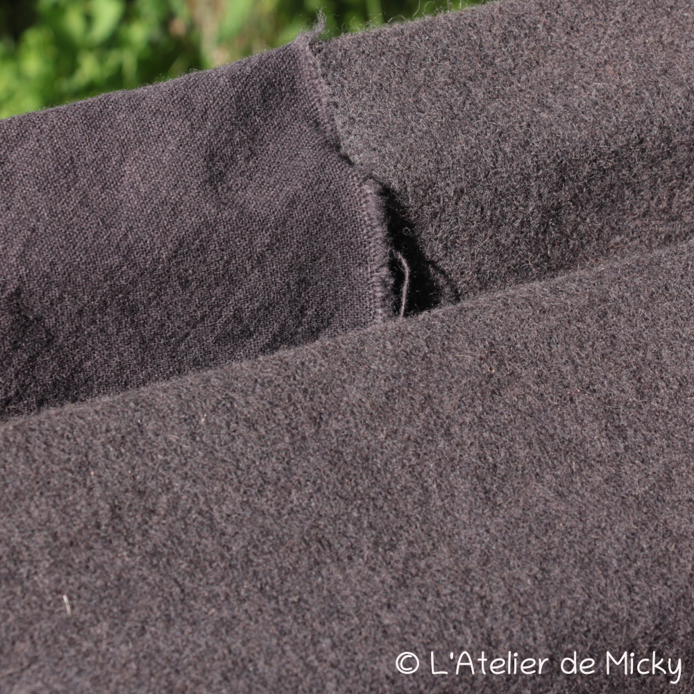 the chosen wool fabric was heavy Coburger Fuchs plain weave, industrial cloth but with a very nice look. Coburger Fuchs is a German breed (which by the way spins beautifully!), off-white with a few russet hairs, that you can clearly see in this close-up.