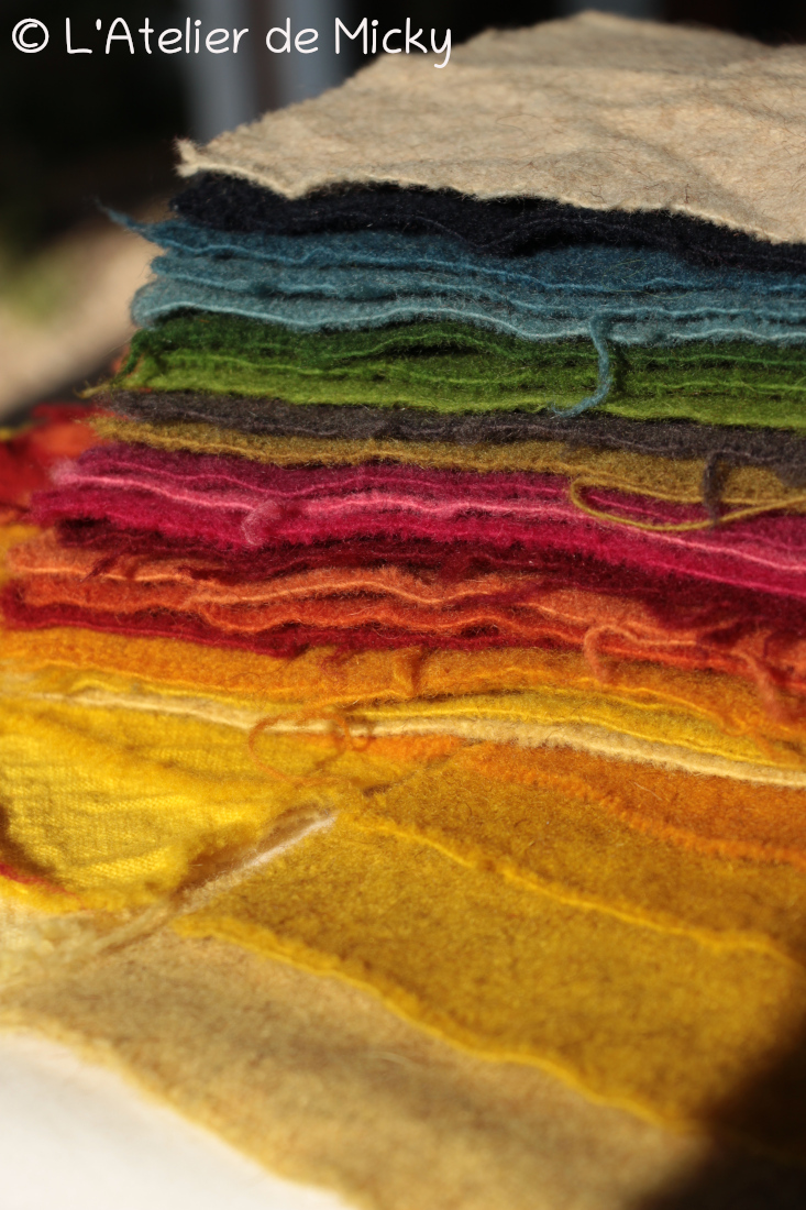 Cet arc-en-ciel de carrés de laine rustique et déjà si belle non teintée… c’est, comme souvent sur ce blog, fort indécent tout ca ! Le cachou a aussi donné une teinte magnifique, moi qui adore les bruns de noix, j’avoue que celui-ci a aussi une profondeur extraordinaire !