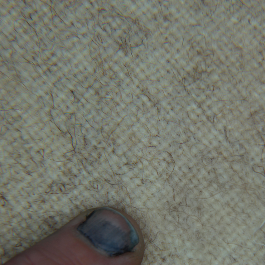 La laine choisie est une toile de laine épaisse, tissage mécanique mais au look vraiment très sympa issu de laine de moutons allemand, le Coburger Fuchs (au passage, c’est une merveille à filer!). La laine est écru avec quelques poils roux, qu’on voit bien sur cette image rapprochée.