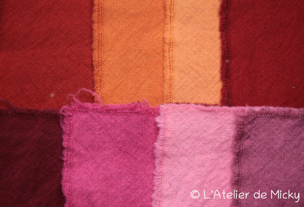 Dans l’ordre de gauche à droite et de haut en bas (sur laine blanche fine): garance 100% puis deuxième et troisième bain, garance + cochenille, 25% cochenille puis bains de suite et enfin cochenille + fer.