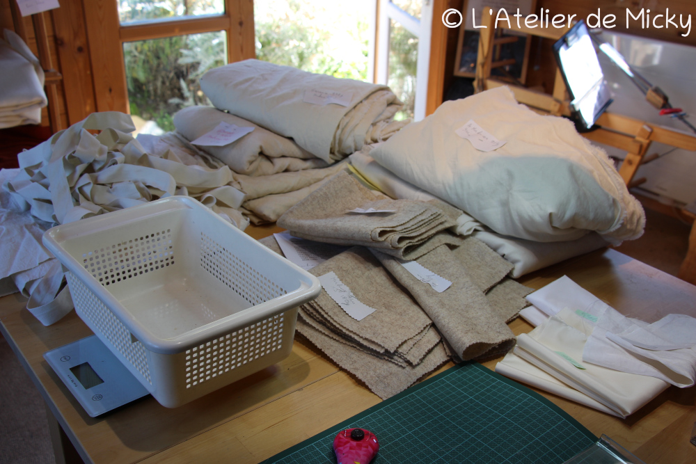 Il a fallu d’abord préparer les échantillons et au passage j’en ai profité pour faire le point sur mes stocks de tissus et peser/étiqueter ceux que je dois teindre pendant l’été.