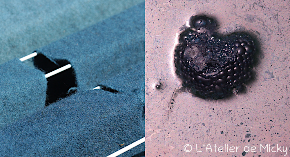 J’ai également été chargée de réaliser un « noir » aux galles de chêne avec du fer, c’est une teinture dont l’usage a été très réglementée pendant le Moyen-Age, car la procédure attaque fortement les fibres. Ici j’ai utilisé une recette hypothétique, car je ne disposais pas de sources exactes et évidemment, je préfère faire mes noirs avec de l’indigo et de la garance, une teinture beaucoup plus douce! J’ai utilisé environ 30% de galles de chêne (issues de Quercus infectoria) et 10-12% de vitriol de fer (sulfate de fer). Ce n’est pas un vrai noir mais plutôt un gris violacé très foncé… Ne faites pas ça chez vous, on entend presque la laine crier!