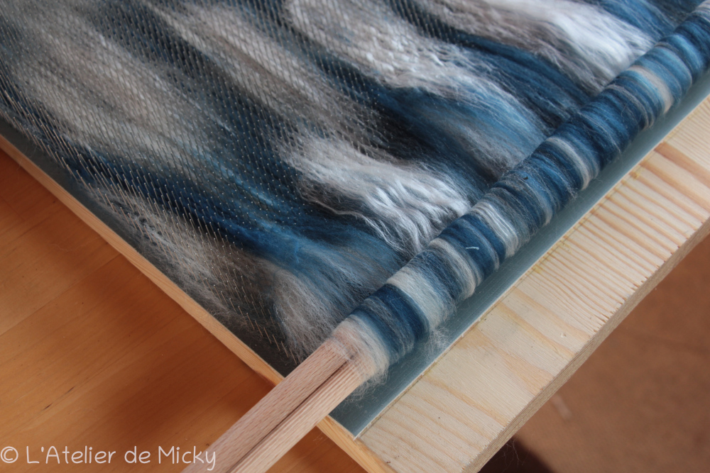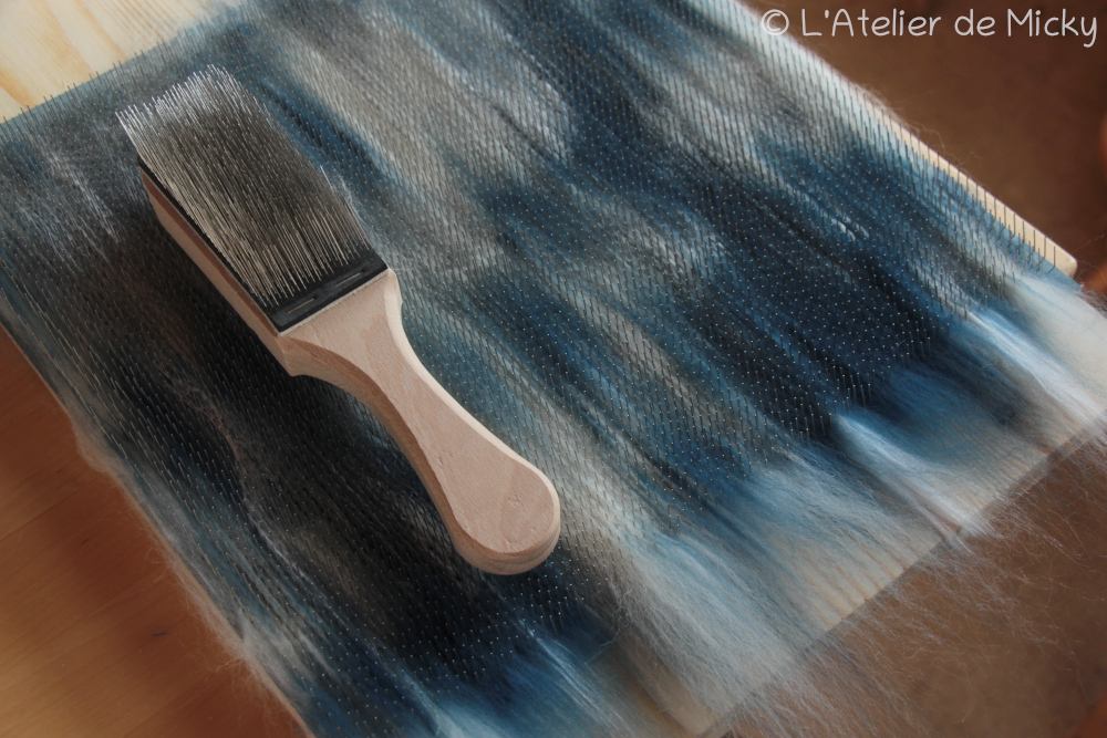 J’ai donc sorti de mes boîtes des laines peignées et c’était parti! Pour commencer, j’avais du mérinos français bio teinté indigo en fermentation et blanc avec une pointe de soie maulbère. On met en place la laine sur le tapis comme on veut puis on peigne pour tasser sur le tapis en plusieurs couches. C’est assez ludique je dois dire!
