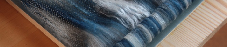 I pulled out some combed wool out of my stash boxes and began! To start with, I had some indigo-dyed and white organic french merino and some mulberry silk. You arrange your wool on the carding cloth and then use the brush to push it in, making a few layers that way. It’s quite some fun I must say!