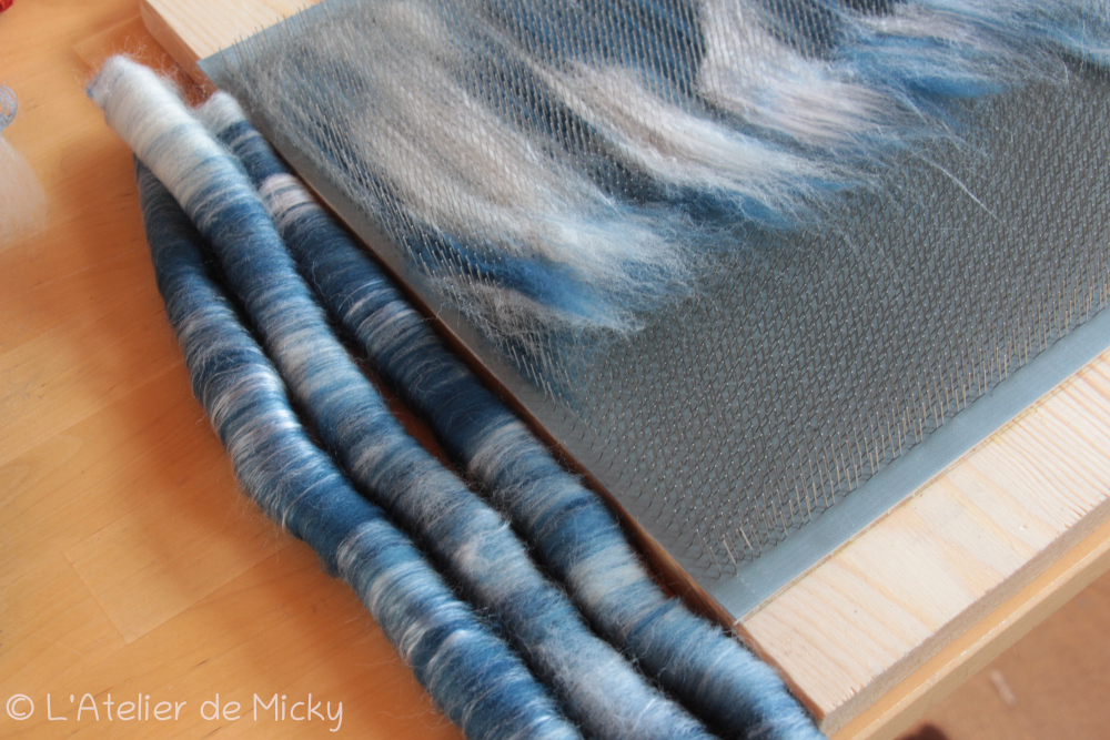 J’avais de la mèche de Gotland et d’Islandais teinté indigo qui étaient un peu feutrés, ça m’a permis de bien les rattraper et d’en faire quelque chose de filable facilement (rolags à droite sur l’image).