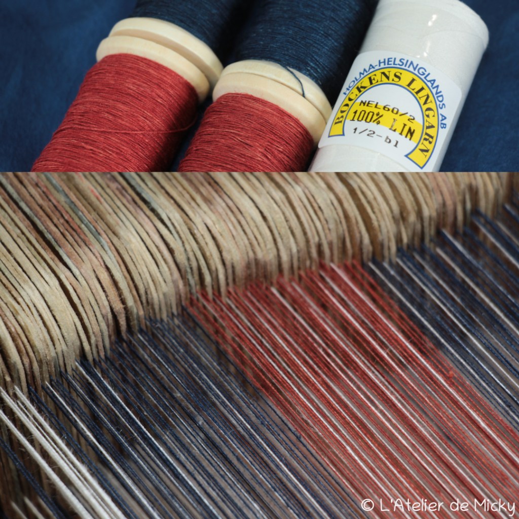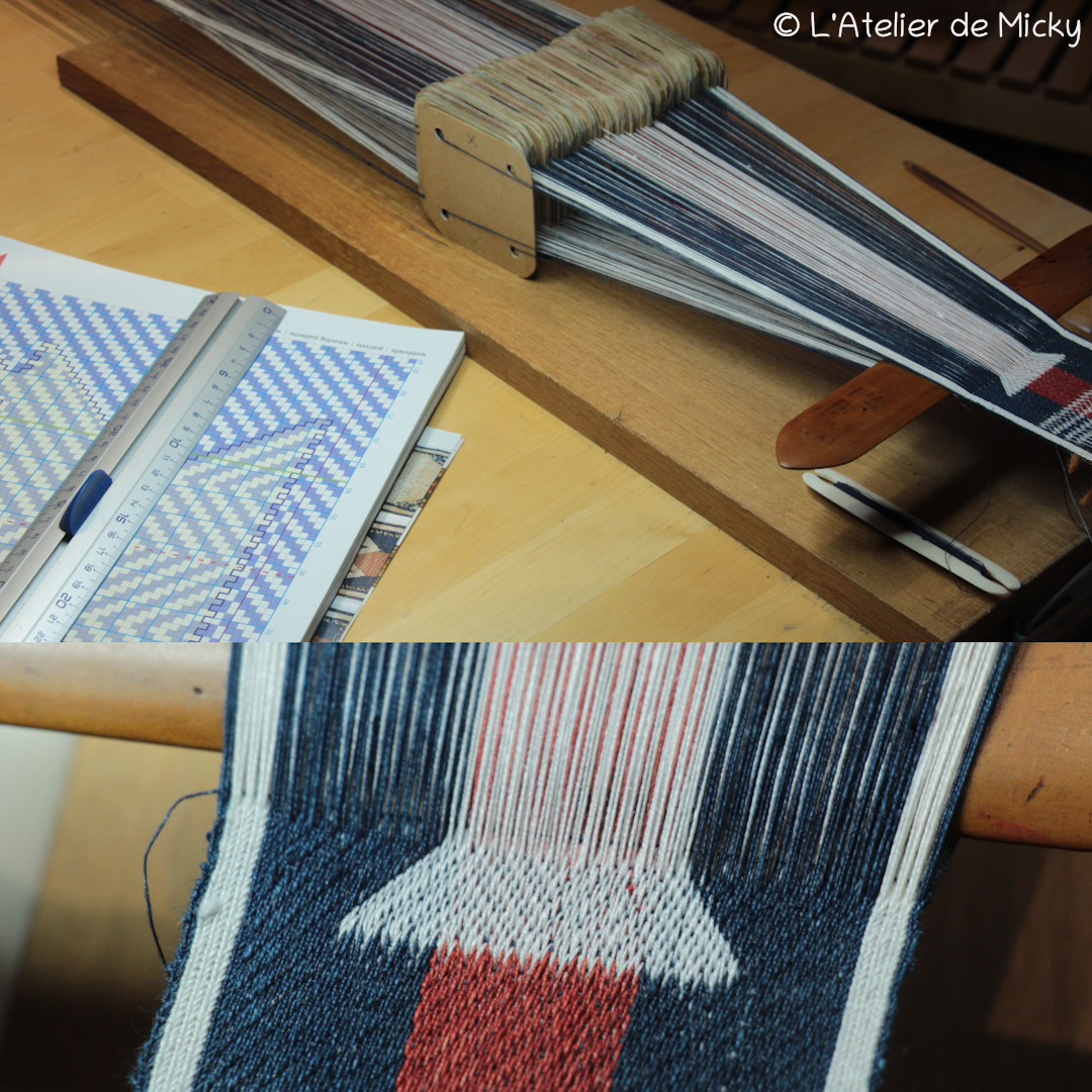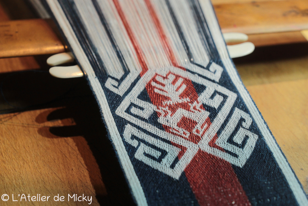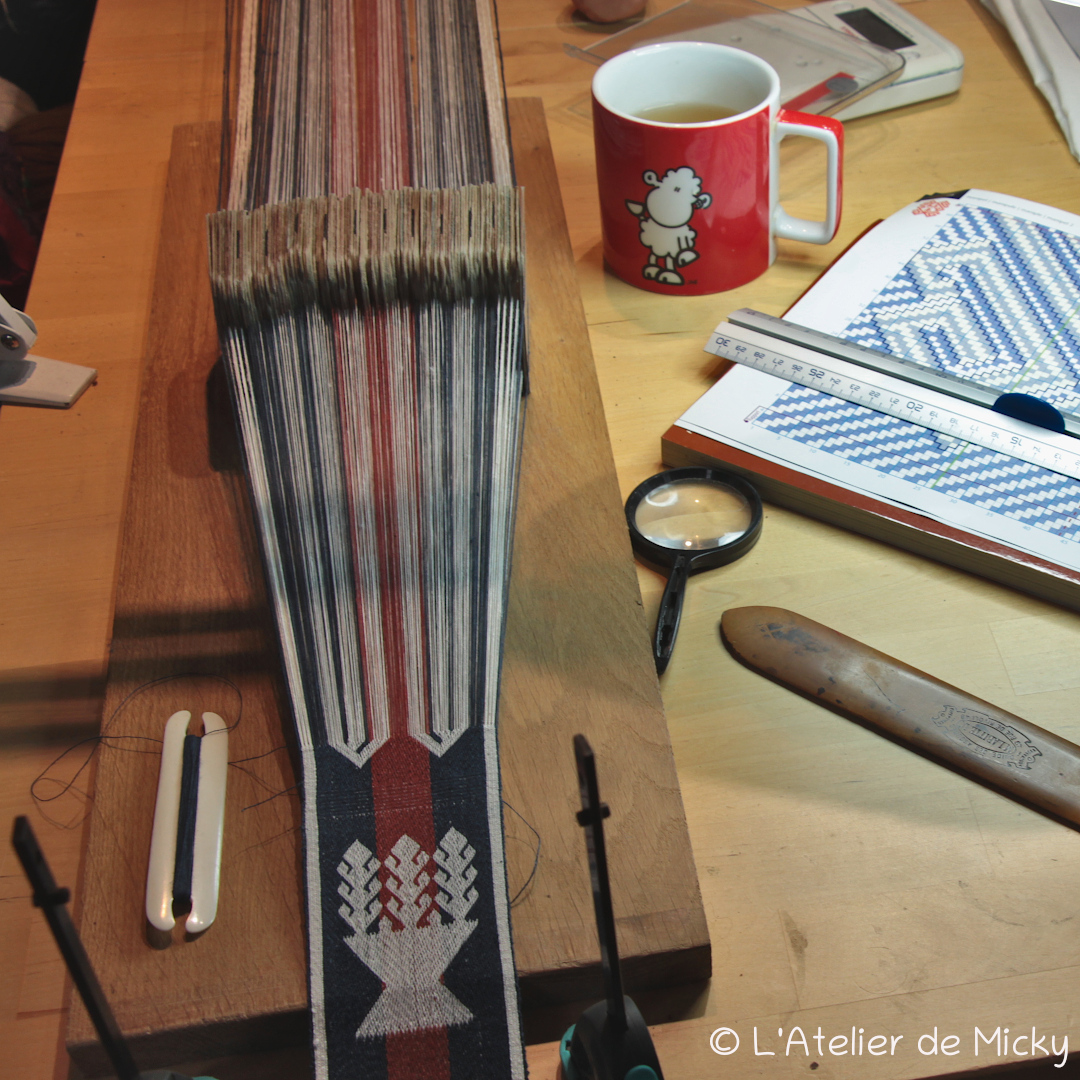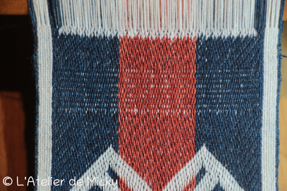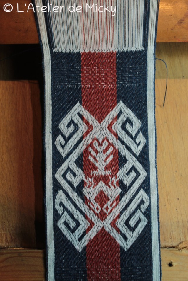 J’avais peur de ne pas avoir assez de fil rouge après avoir ourdi mes tablettes en bleu et blanc, donc la partie rouge est lègèrement réduite par rapport à ce qu’on trouve sur les originaux.