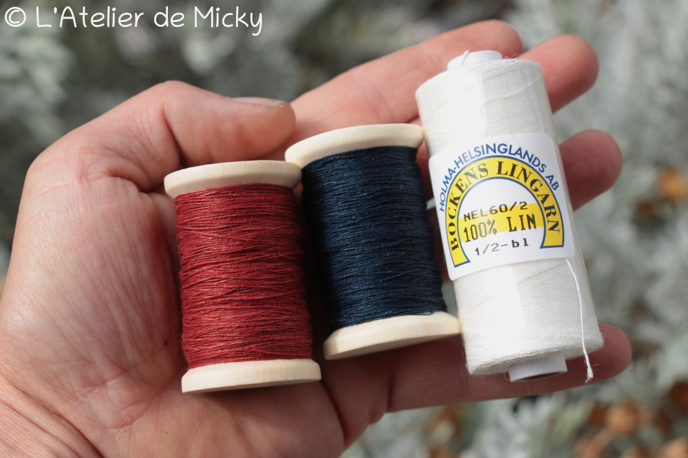Les pièces d’origine comportent 107 tablettes et ont été tissées en lin, il me fallait donc du lin très fin qui résiste bien en tissage aux tablettes. J’ai utilisé du lin prévu pour la dentelle au fuseau, de l’excellente marque suédoise Bockens (les meilleurs fils de lin sur le marché si vous voulez mon avis…). Le galon est de couleur blanche, bleue et rouge. Si la teinture bleu indigo sur du lin ne pose aucun souci particulier, les quelques essais que j’avais déjà fait pour obtenir un beau rouge garance sur lin étaient peu concluants. L’été dernier, j’ai donc réalisé une série d’expérimentations pour parvenir à un rouge digne de ce nom…