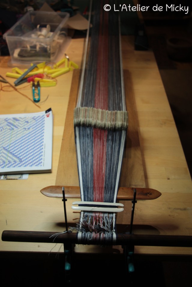 Concernant le poids des pesons, je ne sais pas du tout, je n’ai pas pesé et ça dépend de la matière avec laquelle je tisse! J’ai mis de tout petits pesons légers sur les 2×4 tablettes des bordures bleues et j’ai groupé les autres tablettes de bordures que je peux démêler régulièrement. Ici j’ai fait des groupes de 12-15 tablettes et il doit y avoir 400-500g de pesons pour chaque groupe…