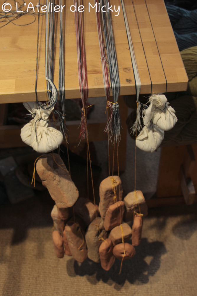 Il y a eu quelques choix à faire au début de ce tissage dont celui de tisser sur un métier ou pas. J’ai finalement opté pour la solution de fixer ma chaine sur la grande table de mon atelier. Je savais que ce tissage prend du temps, et j’aime bien pouvoir poser mes coudes quand je tisse des choses qui prennent du temps. J’ai donc fait l’ourdissage sur mon métier à tisser puis coupé les fils par petits groupes fixés à des pesons… L’installation peut sembler très rudimentaire, mais elle fonctionne vraiment très bien!