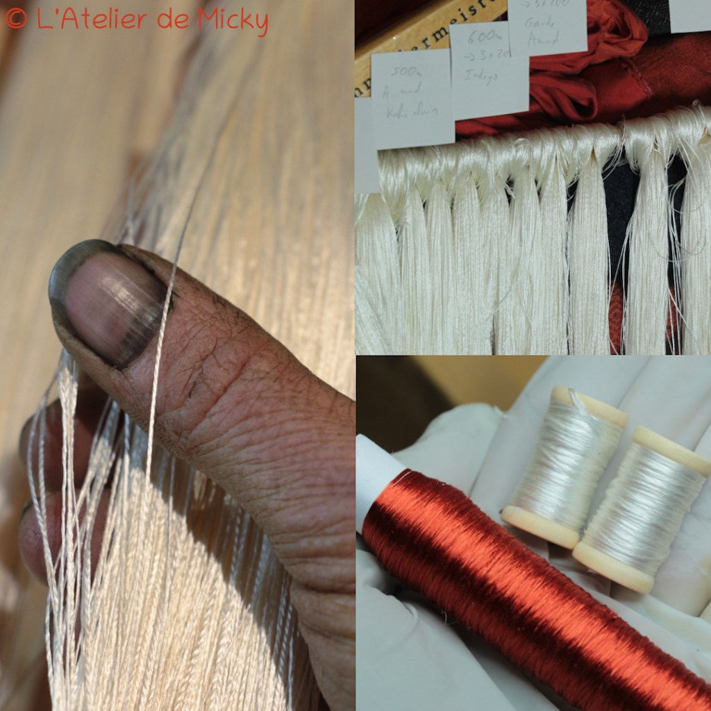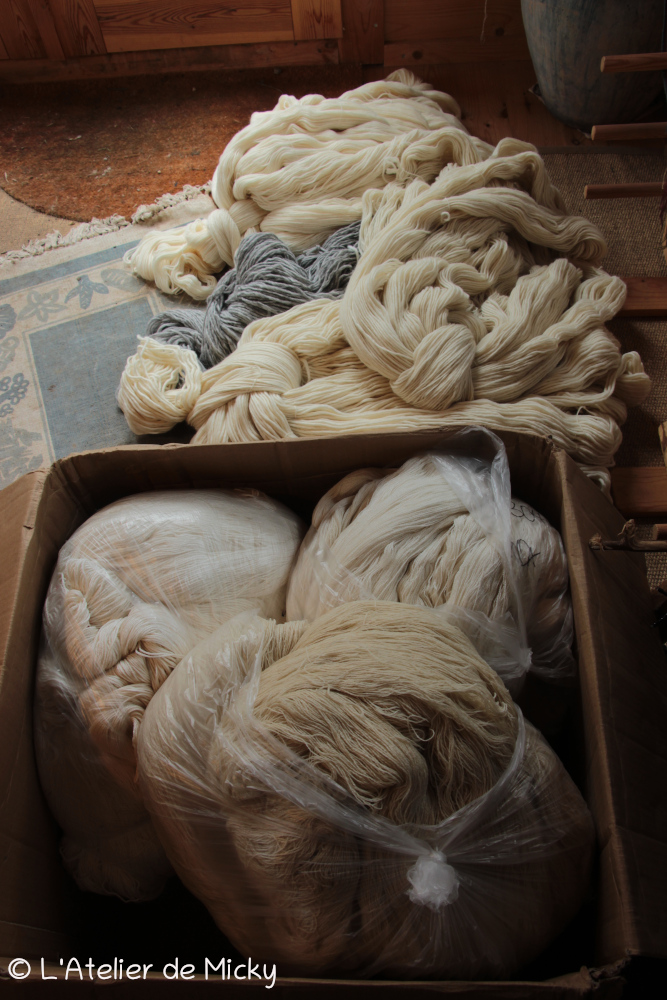 I also have some Soie Ovale (reeled silk) to dye, for orders and some stock. The problem with this beautiful silk is that it is very fragile: made up of filaments, the slightest crack on the skin can snag it and my dyer’s hands are not the ideal tools to handle it! I have to wear latex gloves…