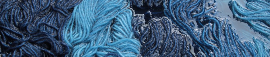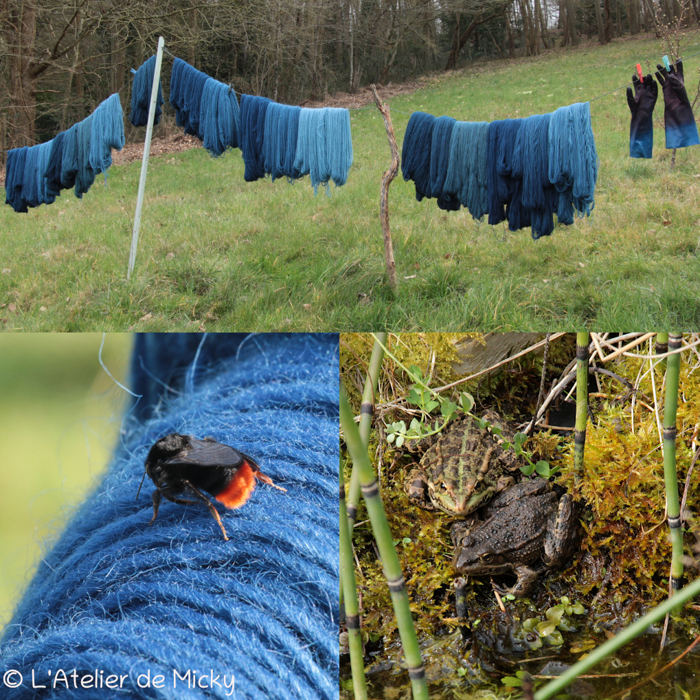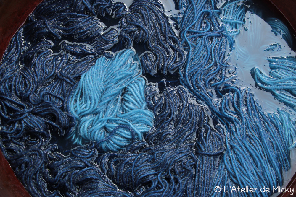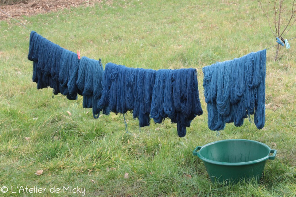 J’ai commencé mes teintures avec du bleu indigo! Quelques kilos d’écheveaux de trois types de laine différents teintés à l’indigo: certains resteront bleus, d’autres deviendront verts avec de la gaude après mordançage.