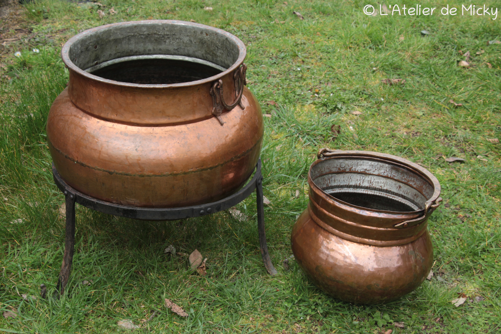 En parlant de chaudrons, je ne vous avais pas parlé de ceux que j’ai ramené d’Allemagne lors du dernier forum textile Une amie m’a déniché des petites merveilles que je viens de nettoyer et de mettre en eau pour voir s’il n’y avait pas de fuites. Ils sont en cuivre étamé, je n’ai jamais utilisé de cuivre étamé en teintures, mais ils ne serviront qu’en animation de toute façon. Le plus grand va parfaitement sur mon trépied en fer forgé.