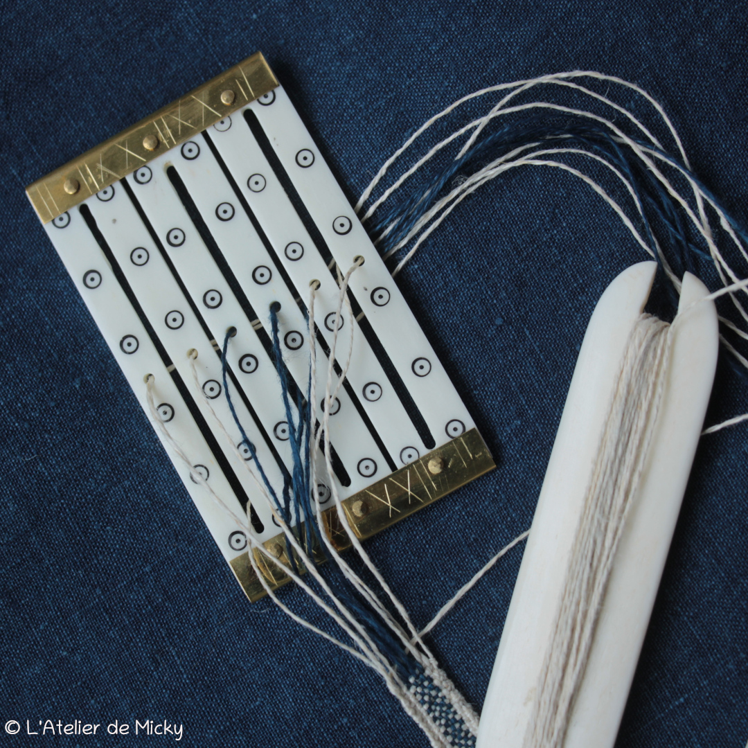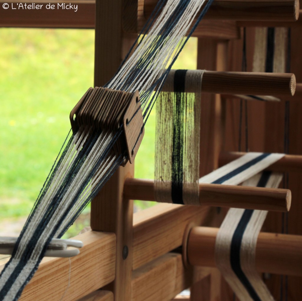 Pour ce tissage, je change de sens de rotation des tablettes tous les 7cm environ. Cela donne une structure régulière que j’aime bien et qu’on voit bien sur cette pièce. Les bordures tournent toujours dans le même sens et les fils sont attachés à des pesons. Simple et efficace!
