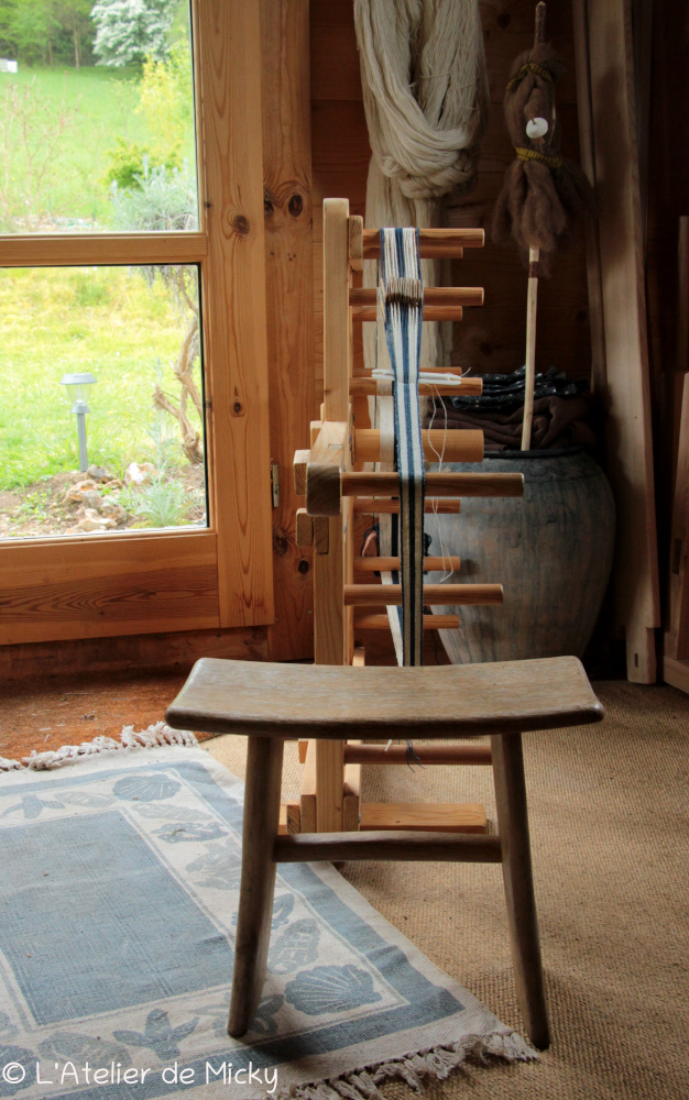 La chaîne est plus longue que ce dont j’ai besoin, cela fera une belle bandoulière de sac aussi! J’aime beaucoup mon grand métier à tisser très confortable et assez léger pour le déplacer très facilement. Si jamais la météo permet de tisser dehors, c’est encore mieux! Ce métier m’accompagne depuis 9 ans maintenant.