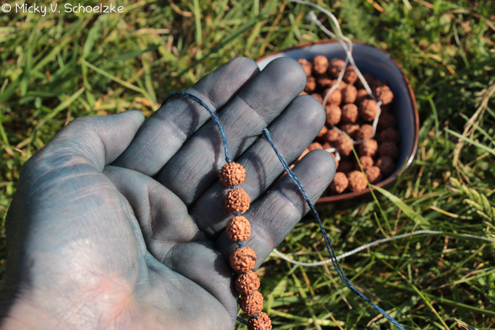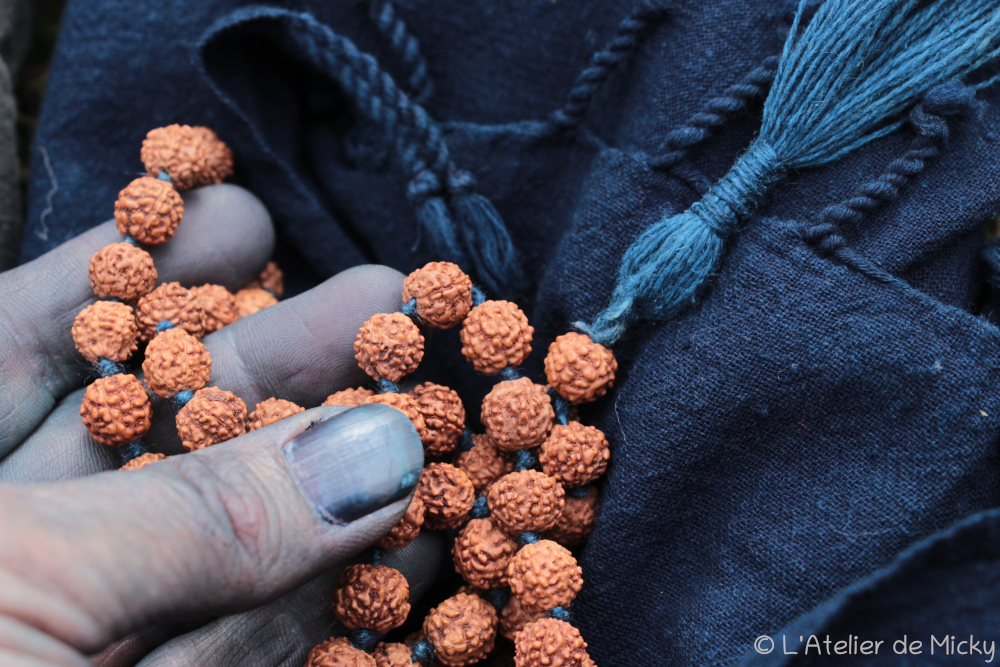 J’ai teinté pas mal de fils de lin et de chanvre ces deniers temps. parfaits pour le tissage aux tablettes, j’en garde toujours pour moi et parfois j’en fait autre chose, ici un collier « mala » avec des perles en graines de rudraksha, le « cerisier bleu » d’Inde, souvent associé à Shiva. j’aime beaucoup les malas, j’en ai plusieurs, mais c’est le premier que je fais moi-même. C’est assez reposant de nouer le collier! Si on en croit les textes védiques, il ne faudra pas consommer d’alcool, ni de carottes ou d’ail ou de viande si l’on veut porter des perles rudraksha, mais je ne suis pas hindouiste…