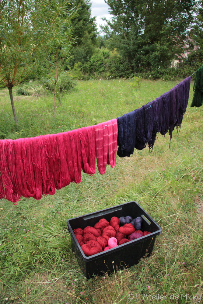 J’ai fini ma grosse session de teintures à la cochenille, avec des nuances allant du bordeaux au rose Barbie et quelques sur-teintures à l’indigo ainsi que des nuançages au fer en passant.