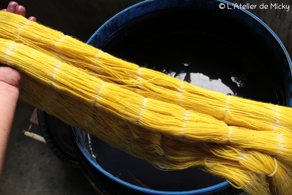 Pour un peu de créativité dans ma routine (si tant est qu’on peut qualifier de créativité le fait de faire des nœuds sur des écheveaux…), je fais aussi des laines « tie and dye » que j’aime beaucoup. Ici un écheveau teinté à la gaude commence sa lente transformation en vert et bleu dans la cuve d’indigo. Il y a pas mal d’étapes: faire des noeuds, mordancer, teinter à la gaude, défaire les noeuds puis tremper plusieurs fois dans la cuve d’indigo.