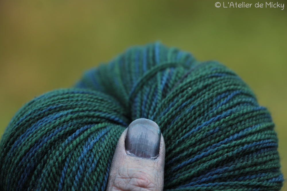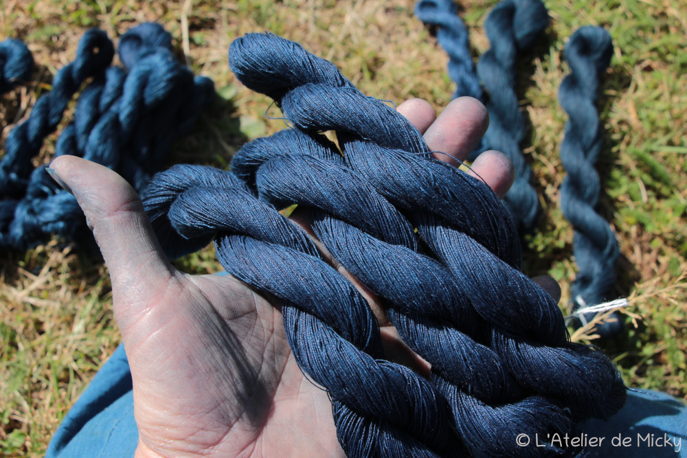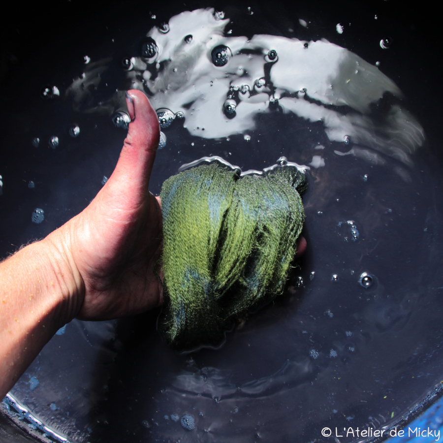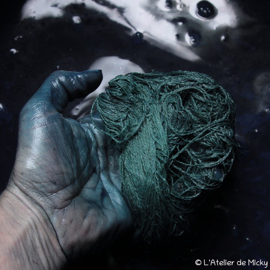For a bit of creativity in my routine (if you can call tying knots on skeins being creative…), I also make tie and dye wools, which I really like. Here a weld-dyed skein begins its slow transformation into green and blue in the indigo vat. There are many steps involved: making knots, mordanting, dyeing with weld, cutting the knots and then dipping into the vat a few times.