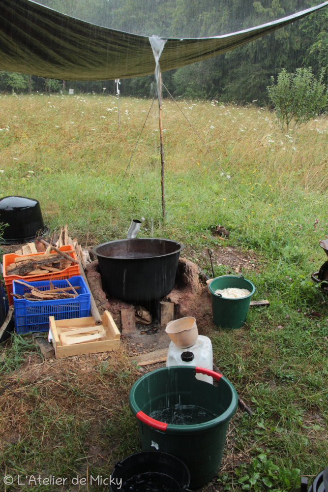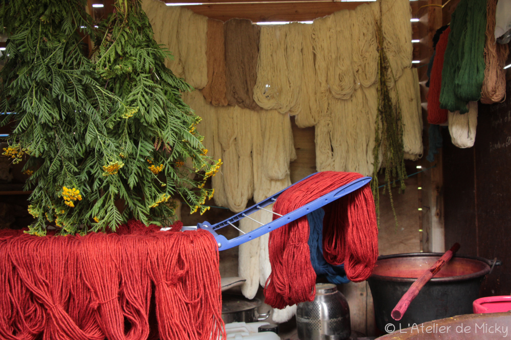 Voici à quoi peut ressembler ma cabane à teintures en fin de journée. Les écheveaux mordancés attendent sagement leur tour sur le mur du fond, des écheveaux teintés finissent de sécher à l’abri pour la nuit sur l’étendoir. des bouquets de tanaisie récoltée pendant que les chaudrons montent en température sèchent et embaument l’air de leur odeur entêtante…